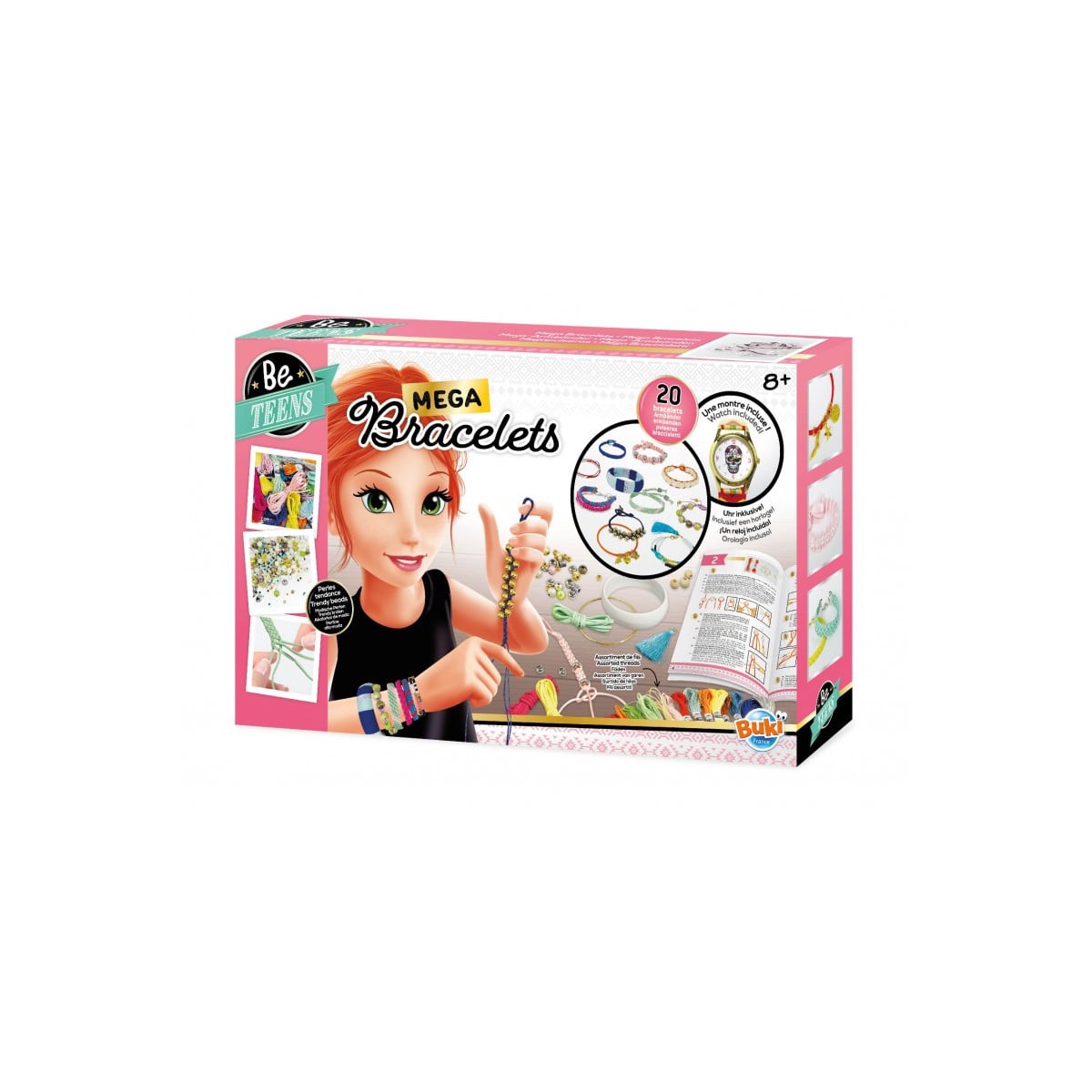 - Incluye: 1 set de creación de mega pulseras con reloj, muchos accesorios para hilar (10 abalorios de formas y colores variados, argollas, 16 hilo, 34 hilos de colores, agujas, entre otros) y guía de instrucciones ilustrada para crear hasta 20 pulseras distintas