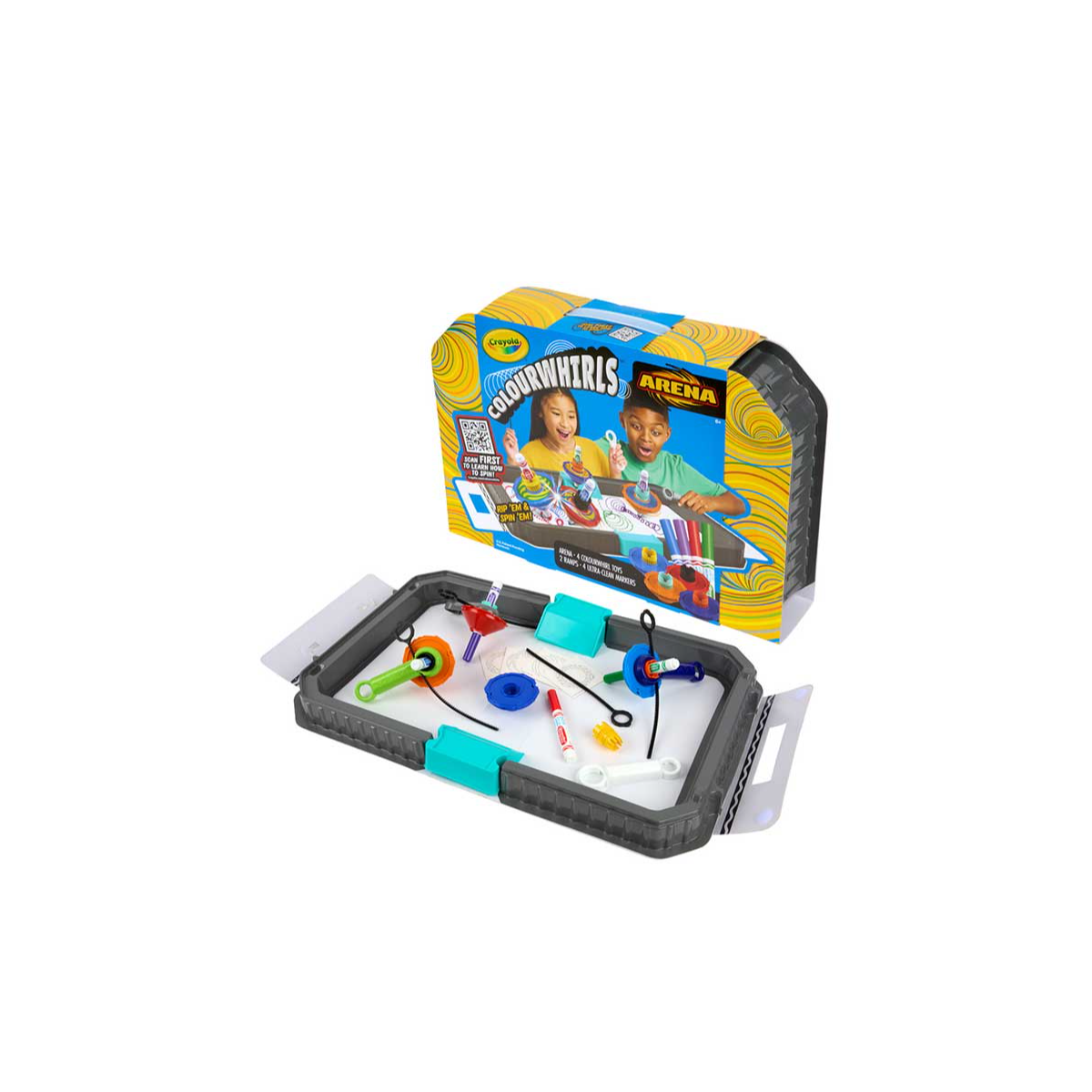 - Incluye: 4 juguetes Colourwhirl, 4 marcadores lavables Ultra Clean, 2 rampas de lanzamiento y una espaciosa arena con almacenamiento integrado para facilitar la limpieza.