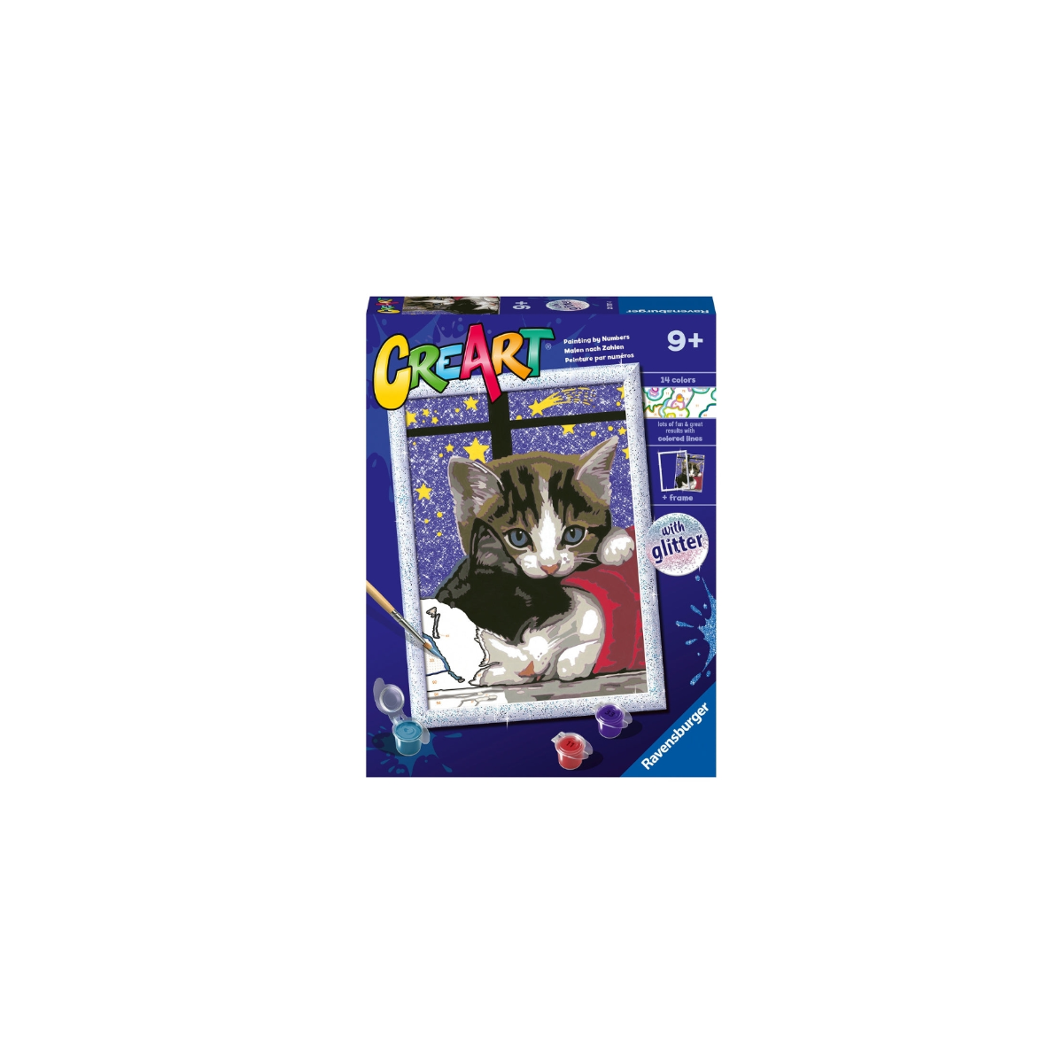 El set CreArt Serie D Gatitos de Ravensburger es perfecto para niñas y niños amantes de los animales y el arte. La escena muestra a un adorable gatito descansando junto a la ventana bajo un cielo estrellado, un diseño lleno de ternura que cobra vida al pintarlo con colores vibrantes y un toque de purpurina que añade un efecto brillante y especial.
