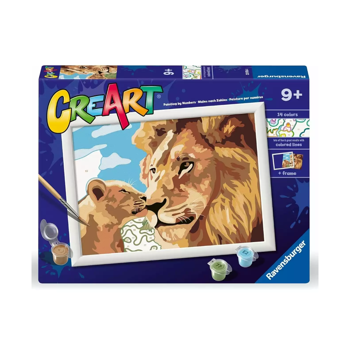 Con el set CreArt Serie D León y Cachorro de Ravensburger, niñas y niños podrán dar vida a una tierna escena de la sabana pintando paso a paso. El cuadro muestra a un león adulto con su cachorro en un momento lleno de cariño, ideal para transmitir ternura mientras se practica la concentración y la creatividad.
