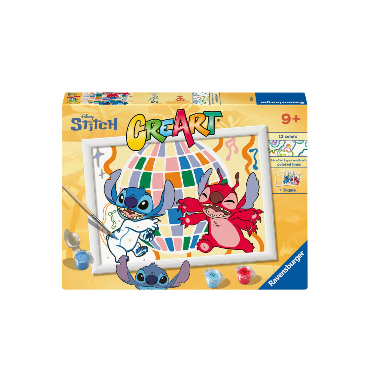 El set CreArt Serie D Stitch & Leroy de Ravensburger es perfecto para niñas y niños que adoran el universo de Disney y quieren disfrutar de la pintura por números. Con este kit podrás dar color a una divertida escena donde Stitch y Leroy bailan frente a una gran bola de discoteca, transmitiendo toda su energía y buen humor.