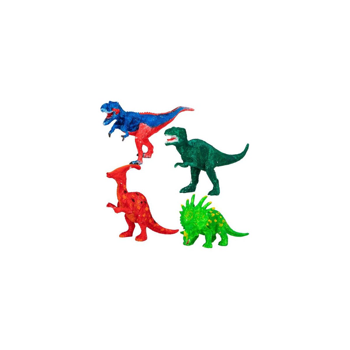 Incluye 4 figuras de dinosaurio: t-rex, gigantosaurio, estiracosaurio, parasaulophus.