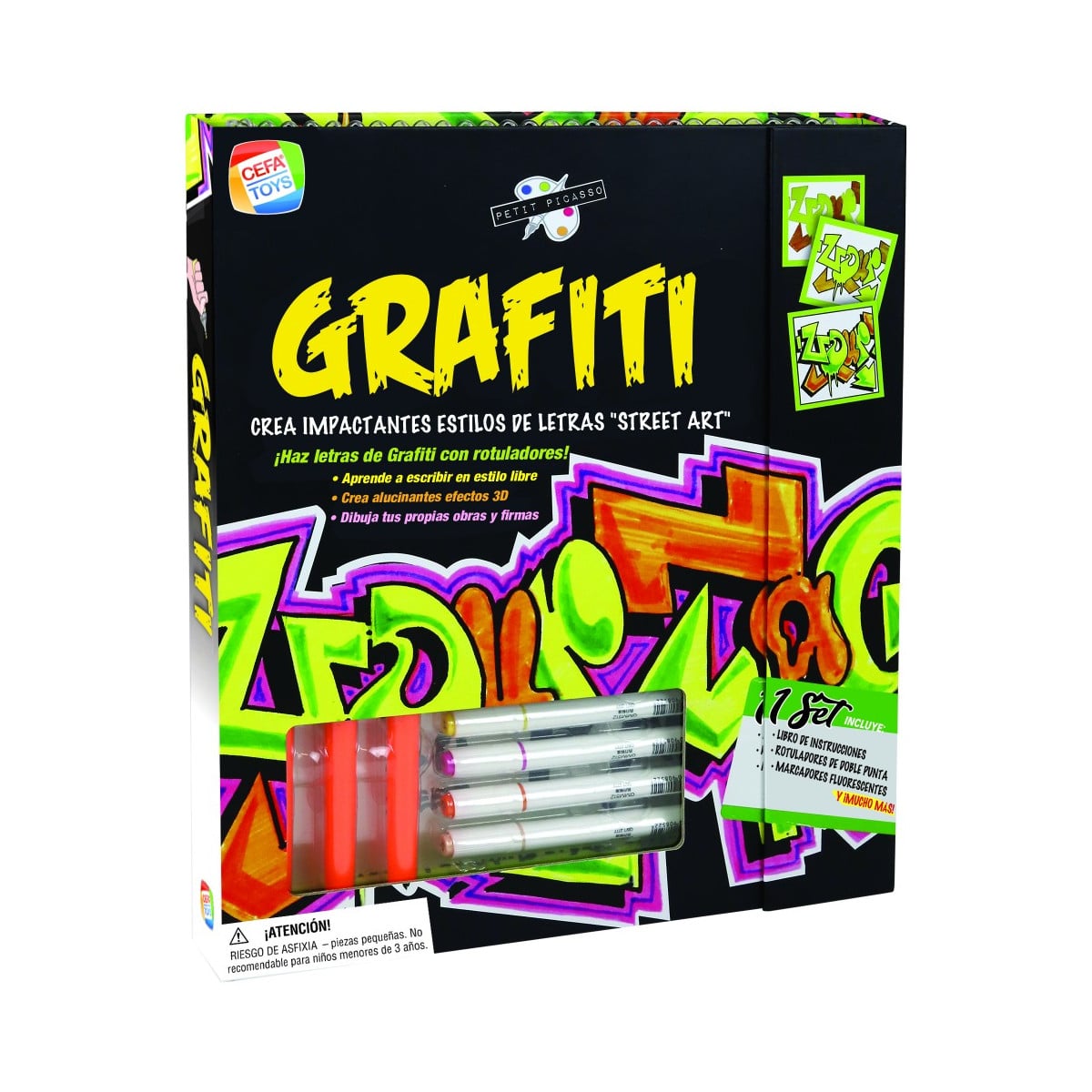 Con el set de Grafiti Petit Picaso aprende a dibujar como un/a auténticx grafiterx. Siguiendo las instrucciones incluidas podrás aprender a escribir en estilo libre, hacer efectos 3D y diseñar tu propia firma.