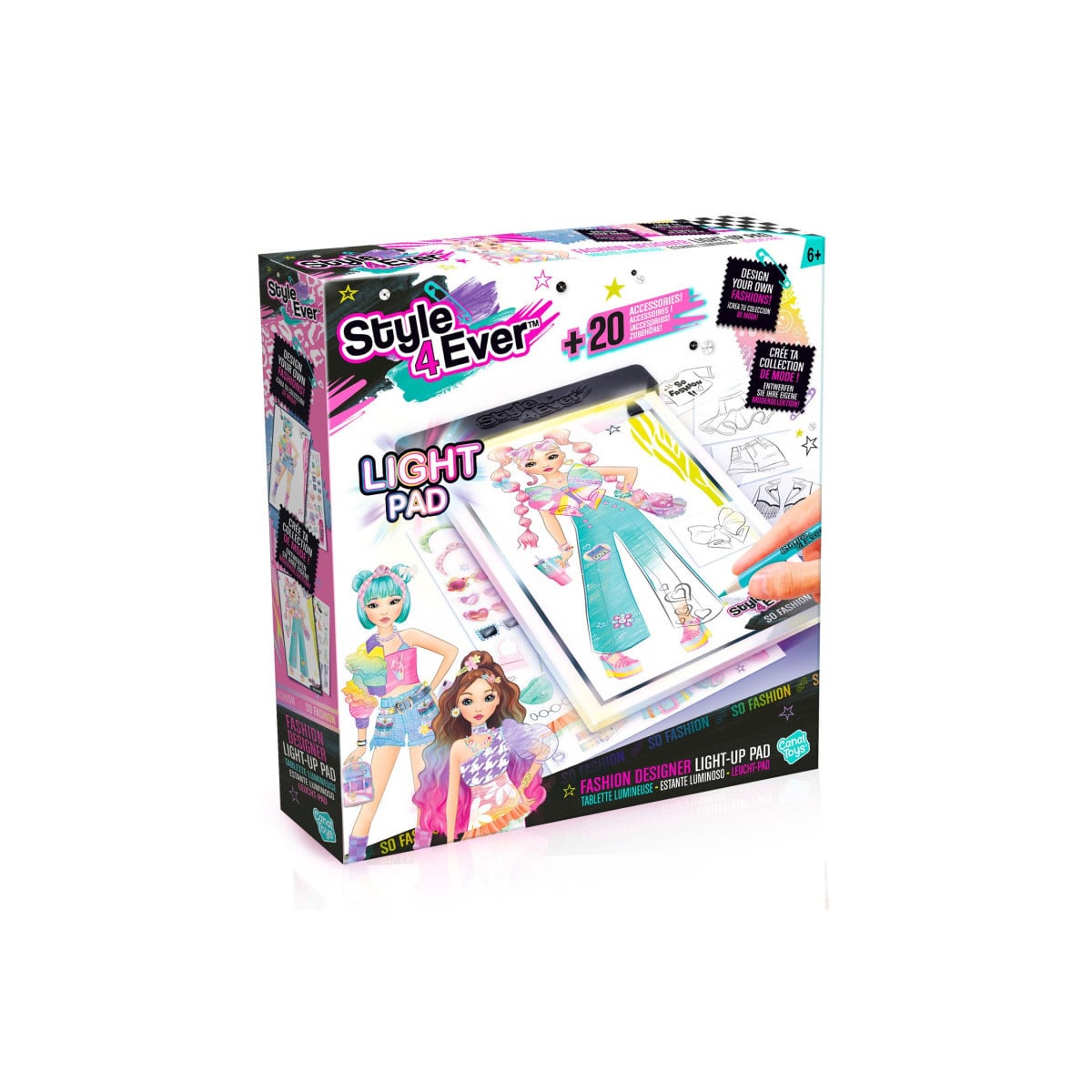 Descubre Style 4 Ever Fashion Designer Light Up Pad, el set creativo con tableta luminosa, plantillas y pegatinas para diseñar tus propios modelos.