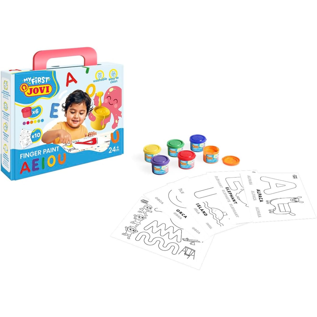 Maletín Jovi My First con pintura de dedos y plantillas para aprender las vocales. Incluye 6 botes de colores y 10 láminas educativas para pintar y jugar.