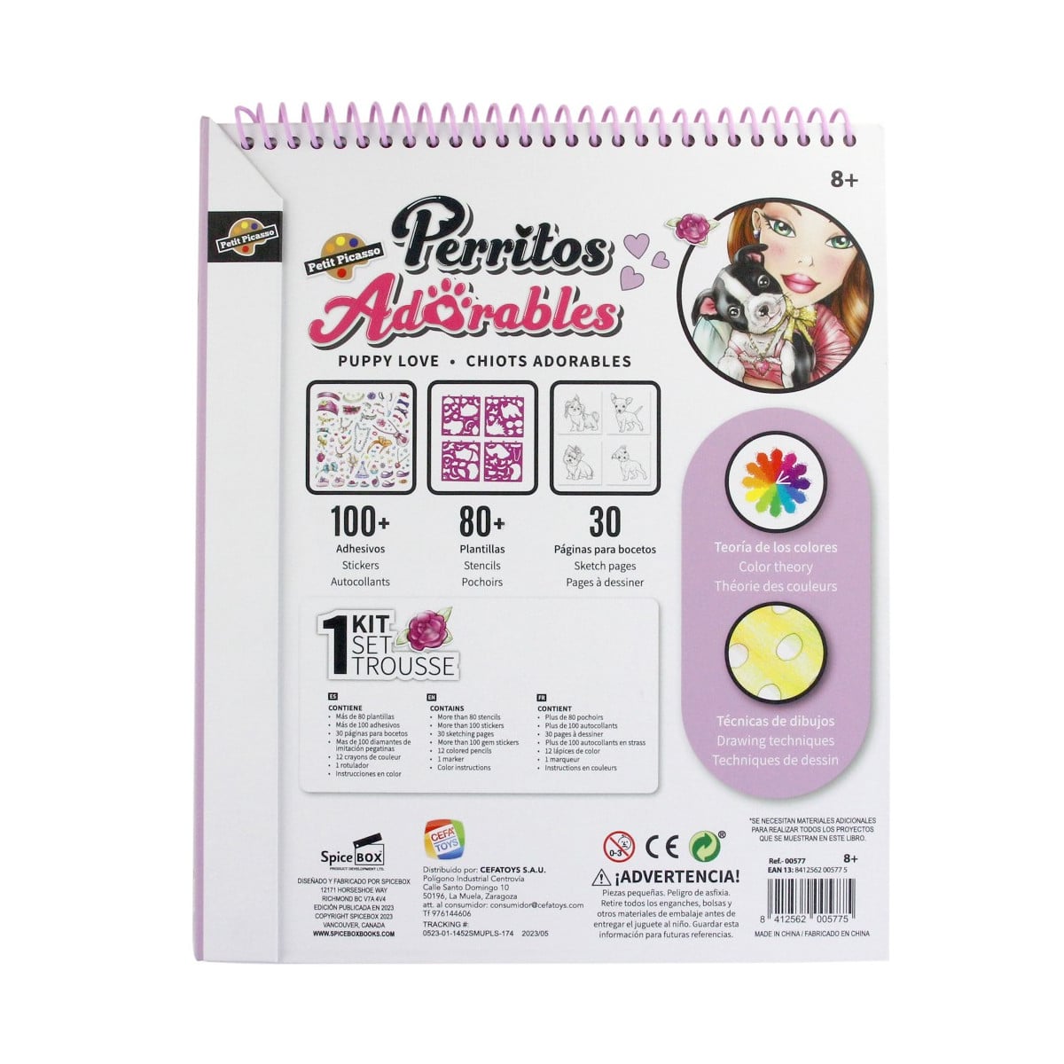 Si te encanta dibujar, el set de Perritos Adorables de Petit Picasso te encantará. Gracias a las plantillas incluidas en el set podrás agregarles accesorios de moda y adornos de manera muy sencilla. Da color a tus creaciones con los lápices de colores, y decora con las pegatinas de piedras preciosas.