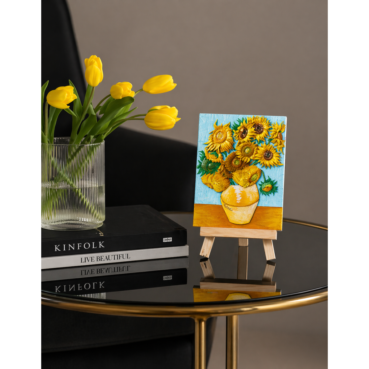 - Diseño / obra: Representa un cuadro de girasoles inspirado en el estilo clásico de bodegones florales.