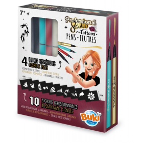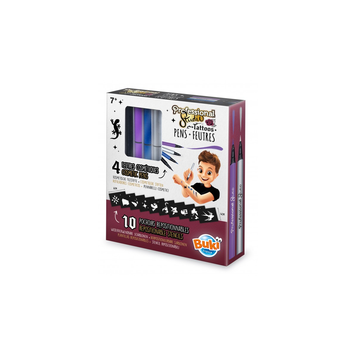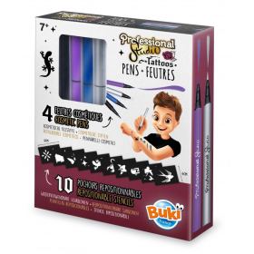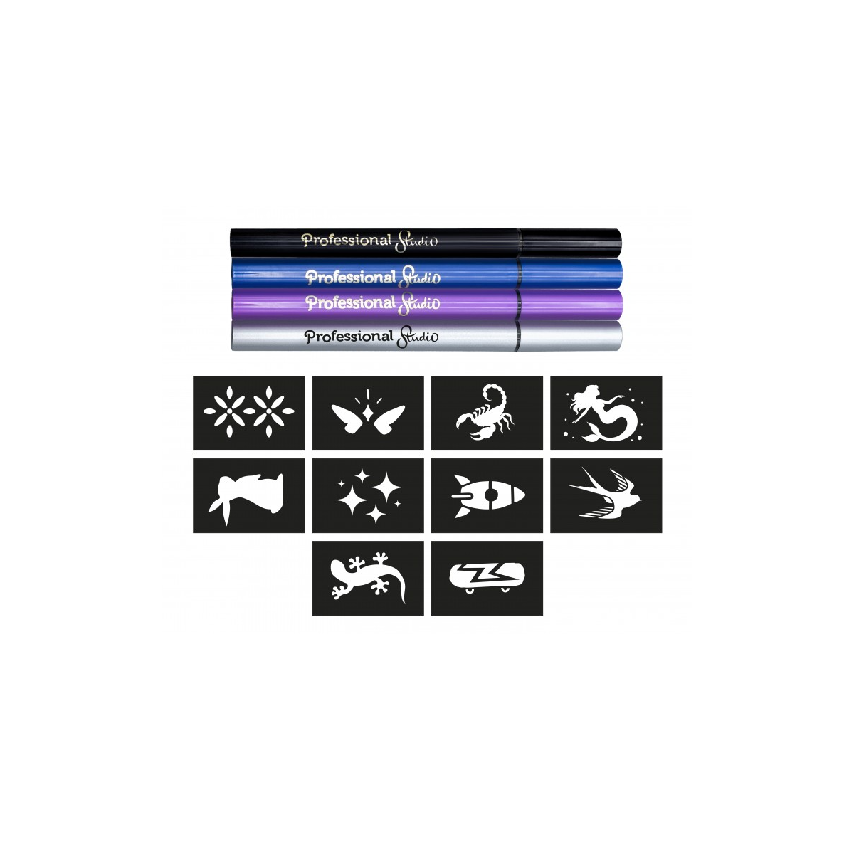 Para quienes prefieren seguir un diseño en lugar de dibujar a mano alzada, el set incluye 10 plantillas reposicionables con formas superdivertidas: estrellas, una sirena, un cohete, un escorpión, una golondrina, un monopatín, un lagarto, mariposas y más. Las plantillas se adhieren suavemente a la piel, permitiendo colorear dentro del diseño sin que se muevan, y luego se pueden retirar y colocar otra vez todas las veces que haga falta.
