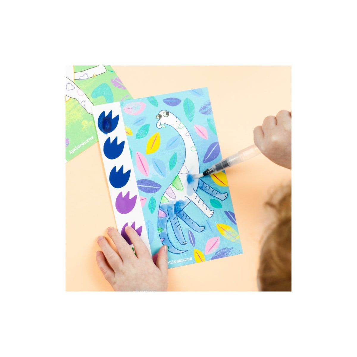 El set contiene 16 páginas ilustradas con diferentes dinosaurios, cada una con 6 colores integrados. Solo hay que rellenar el pincel mágico con agua, activar los pigmentos y empezar a pintar. Además, incluye una herramienta de esponja que permite experimentar con diferentes efectos y acabados.