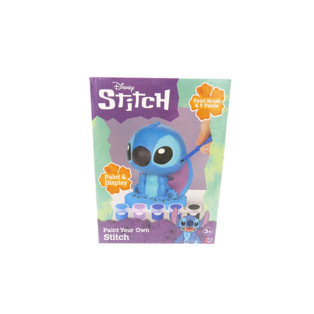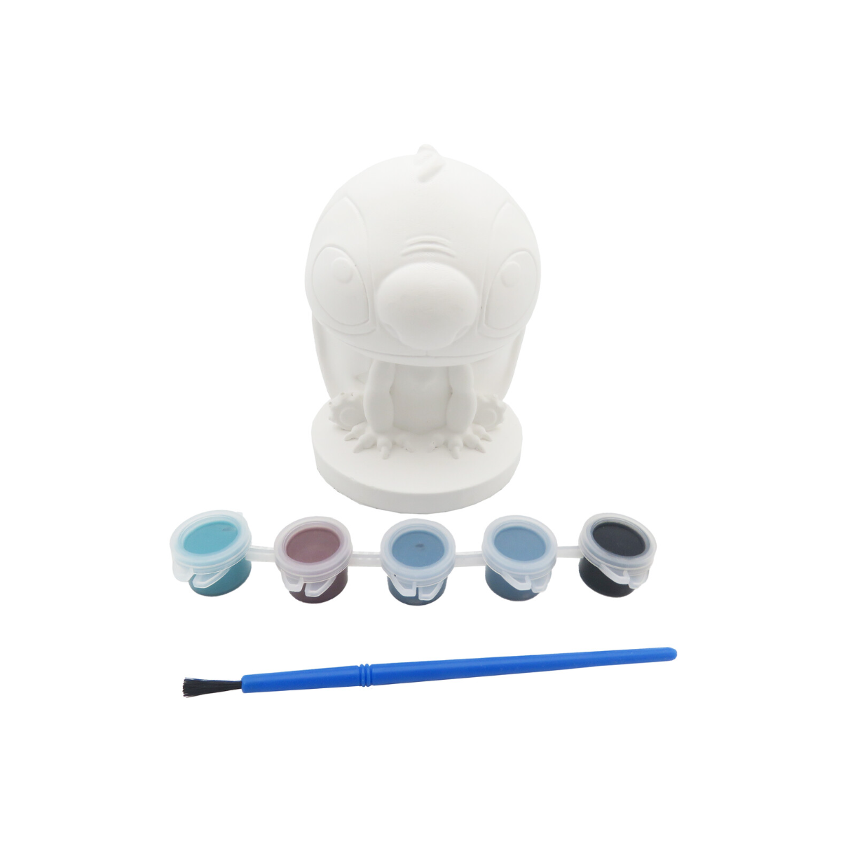 El pack incluye una figura de escayola lista para decorar, junto a cinco botes de pintura de diferentes colores y un pincel, ofreciendo todo lo necesario para empezar a pintar sin complicaciones. Gracias a su formato práctico, es un set perfecto para tardes de manualidades en casa, actividades en familia o incluso como regalo original para fans de Stitch. Además, cada creación será distinta, lo que aporta un valor especial al resultado final.