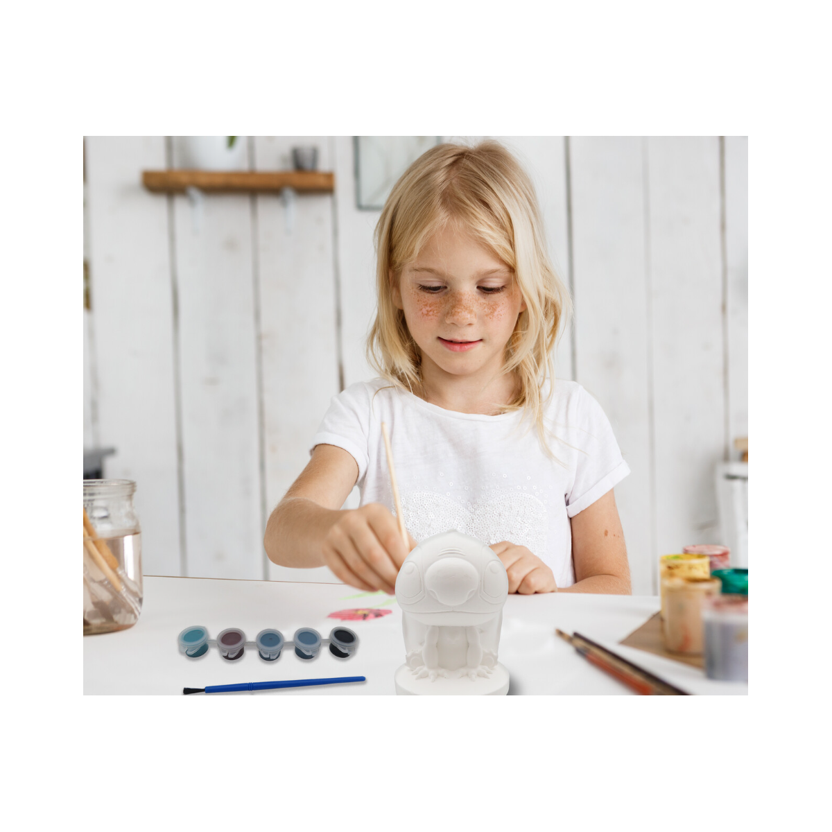 - Incluye: 1 figura de cerámica, 5 botes de pintura y un pincel.