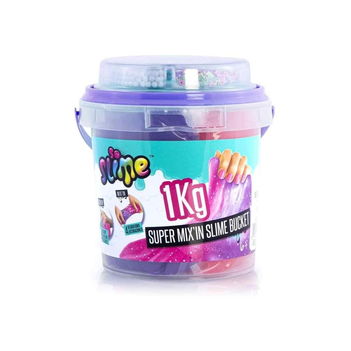 En este Giant Slime Bucket encontrarás también diferentes decoraciones para que puedas personalizar tus slime. Estruja, estira, amasa...¡y decora tu slime! Además podrás utilizar el cubo para guardarlo.