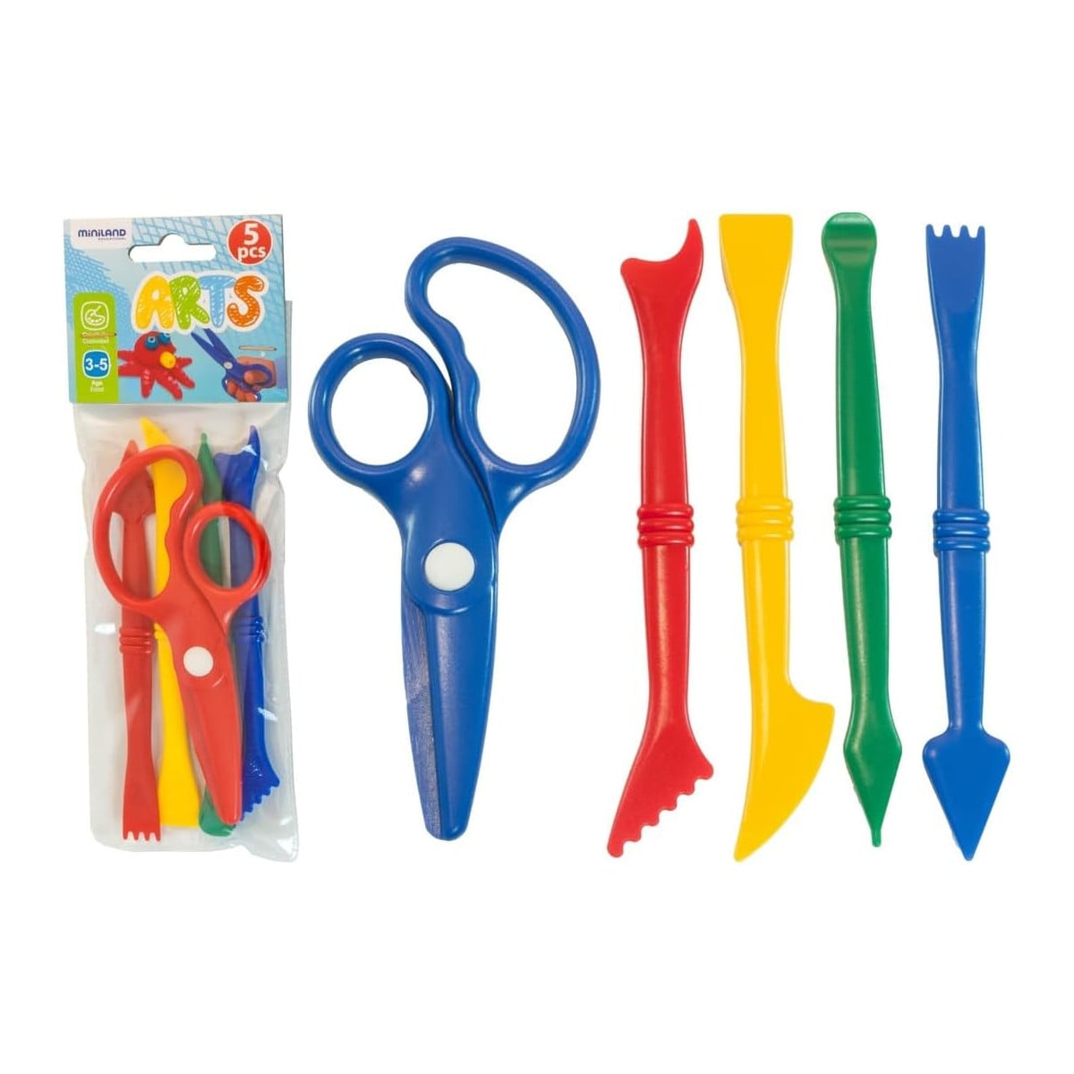 El pack incluye 5 accesorios: una tijera de seguridad y cuatro herramientas multicolor con diferentes formas, ideales para cortar, marcar, estampar o dar forma a la plastilina. Con ellas, los niños y niñas pueden experimentar con distintas texturas y crear todo tipo de figuras.