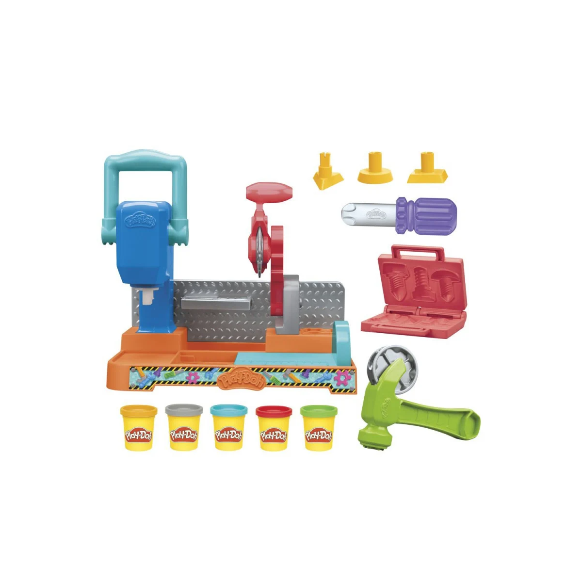 - Set completo de herramientas de juguete: Un martillo, un destornillador, y unos moldes para poder jugar con los cinco botes de plastilina que incluye el set.
