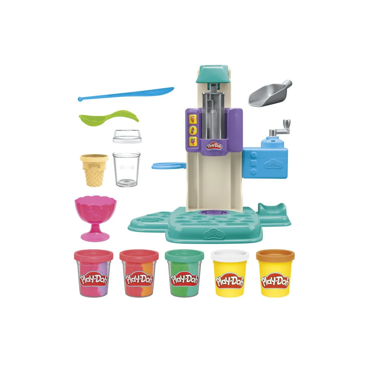 - Incluye: una cuchara, un cuchillo de juguete, una cuchara para chispas, un plato, un cono y una copa con tapa. También incluye 5 botes de plastilina Play-Doh y 3 de ellos son bicolor.