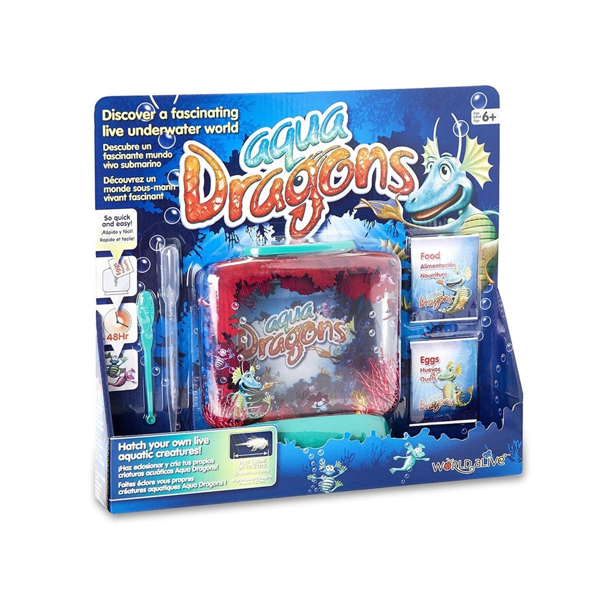 El Kit Aqua Dragons Underwater incluye un tanque decorado por completo, huevos, comida, una cuchara y un burbujeador de agua,