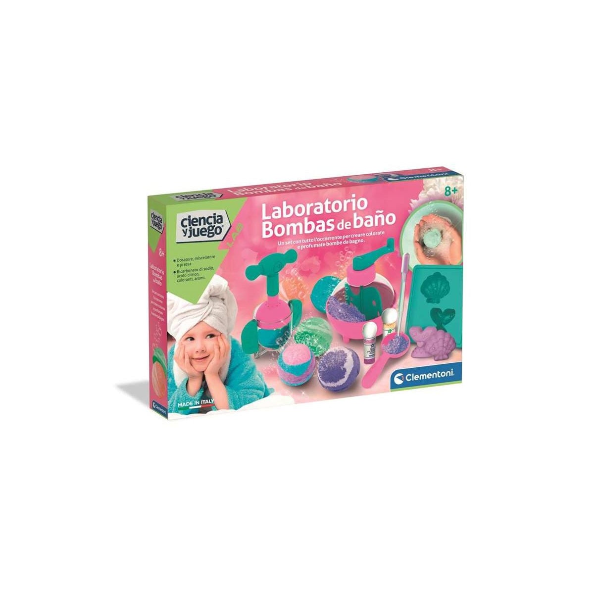 Laboratorio para crear bombas de baño Clementoni. Juego creativo y científico con experimentos seguros. Ideal para niños y niñas desde 6 años.