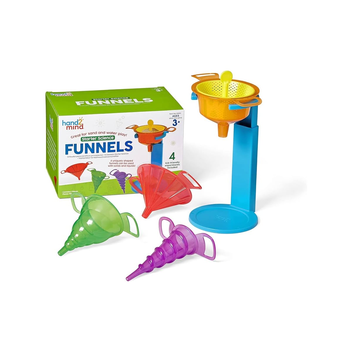 - Incluye: 4 embudos, soporte, tamiz y guía con 4 experimentos.