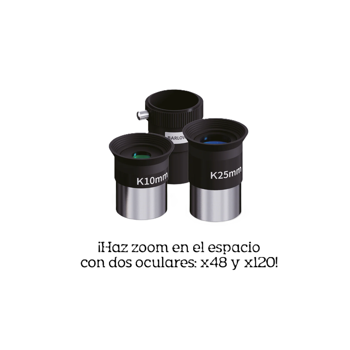 - Aumentos: Uno de 48x y otro hasta x120 para observar la Luna y objetos celestes con claridad.
