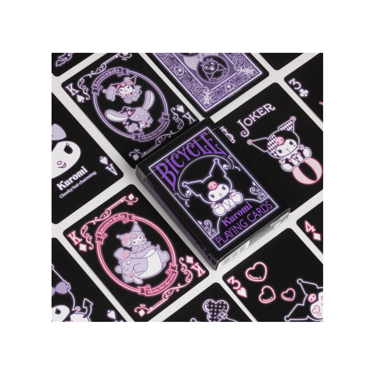 La Baraja Bicycle Kuromi Europe es un mazo inspirado en el querido personaje de Sanrio, Kuromi, que luce su distintivo sombrero de bufón negro con una calavera rosa y cola de diablillo. Esta versión combina tonos vibrantes en rosa neón y morado sobre un fondo negro audaz, ofreciendo una estética moderna, un punto traviesa y totalmente Sanrio. Cada carta se ha diseñado con detalle para transmitir esa mezcla de encanto y rebeldía que caracteriza a Kuromi.