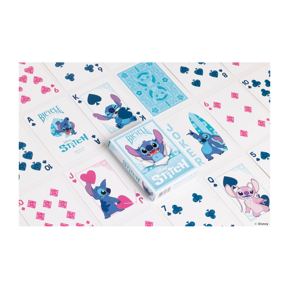 La Baraja Bicycle Stitch Disney mezcla el humor y la ternura del experimento 626 con la calidad superior de Bicycle. Desde el estuche, Stitch parece “romper” el embalaje con travesura, invitándonos a adentrarnos en su mundo con un diseño que fusiona alegría y descaro. En el reverso y en las cartas de la corte aparece su inseparable “ángel boojiboo”, Angel, mientras que los dorsos combinan motivos tropicales y detalles de foil que reflejan la magia hawaiana de Lilo & Stitch.