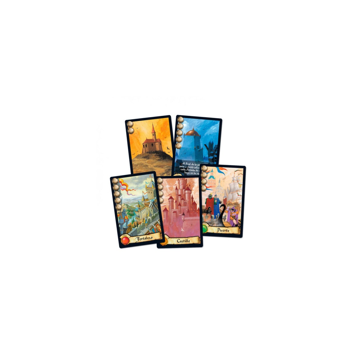 - Componentes: Incluye 8 cartas de personaje, 68 cartas de distrito, 7 cartas de ayuda, 1 marcador de corona, monedas de oro y un manual de instrucciones