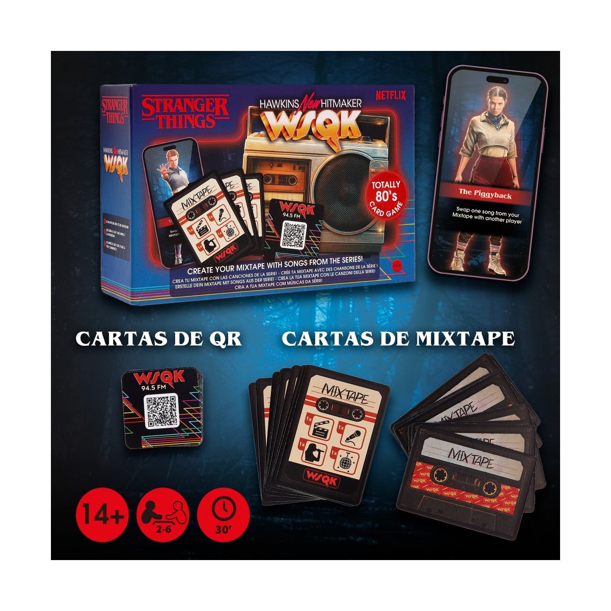 Stranger Things Hawkins Hitmaker es un juego de cartas inspirado en la música y la estética ochentera de la serie. El objetivo es identificar canciones y artistas de los años 80 mientras construyes tu propia “mixtape” para sumar puntos y superar distintos desafíos.