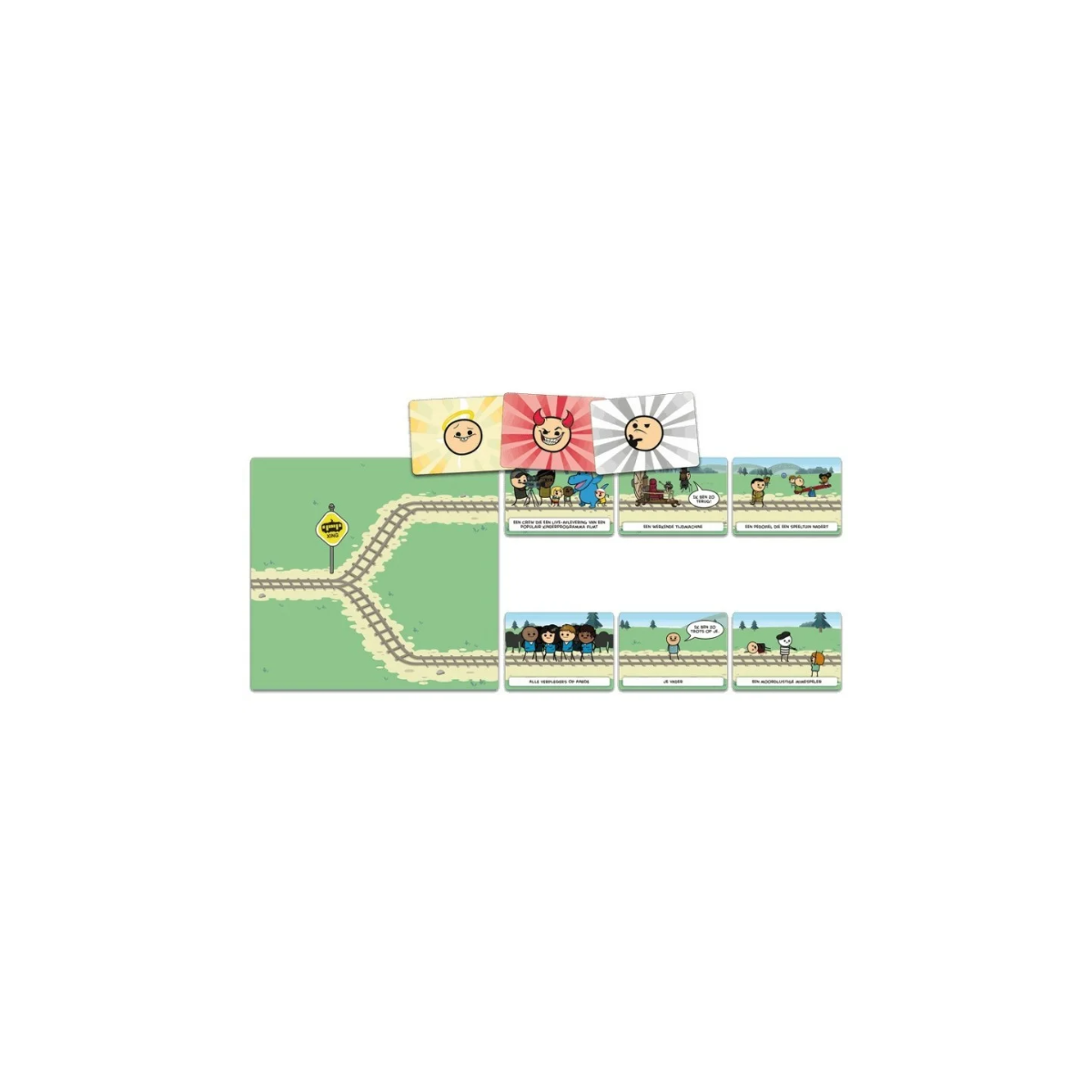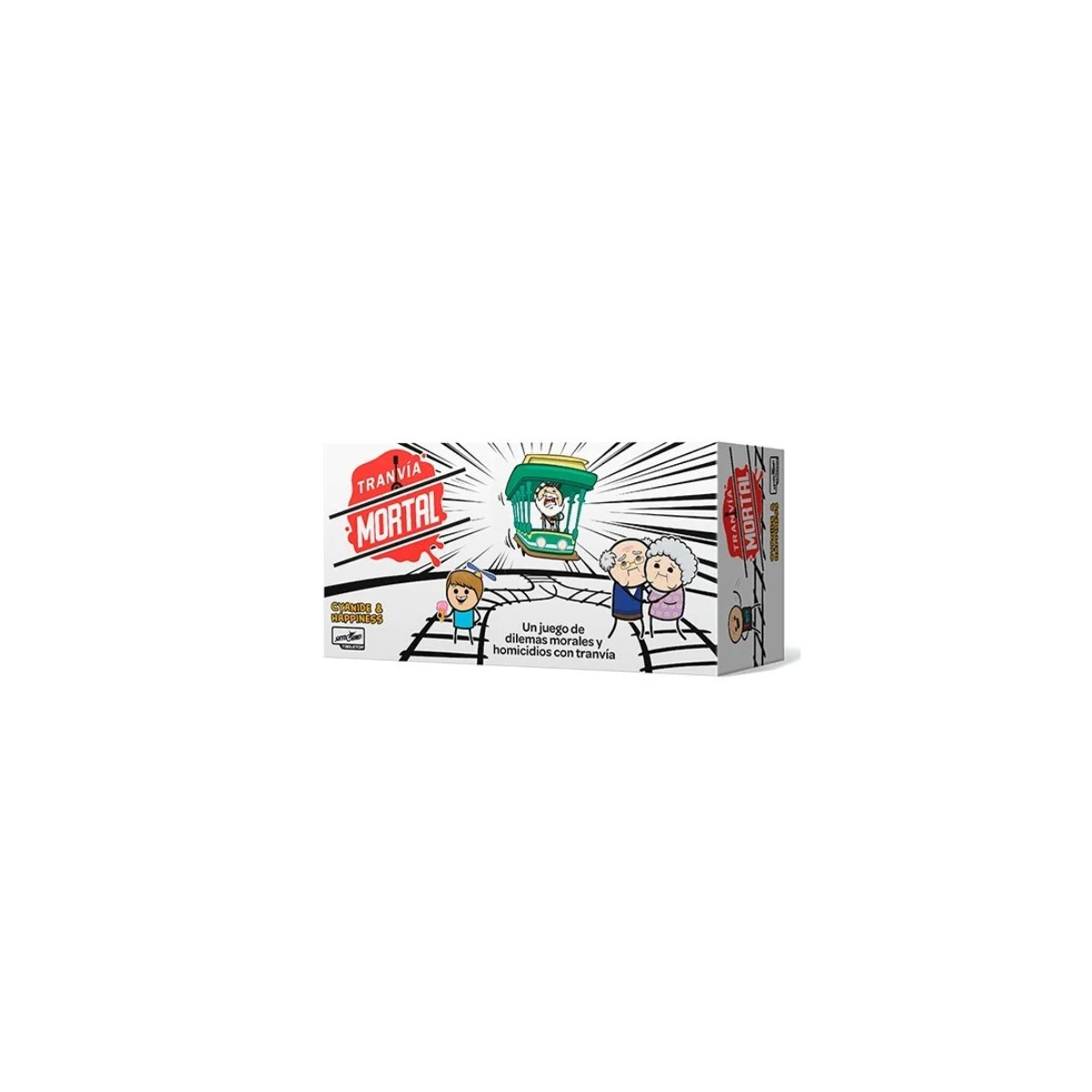 Un juego de mesa con dilemas morales, humor negro y mucha risa. ¡Defiende tu vía del tranvía y elige a quién atropellar con argumentos absurdos!