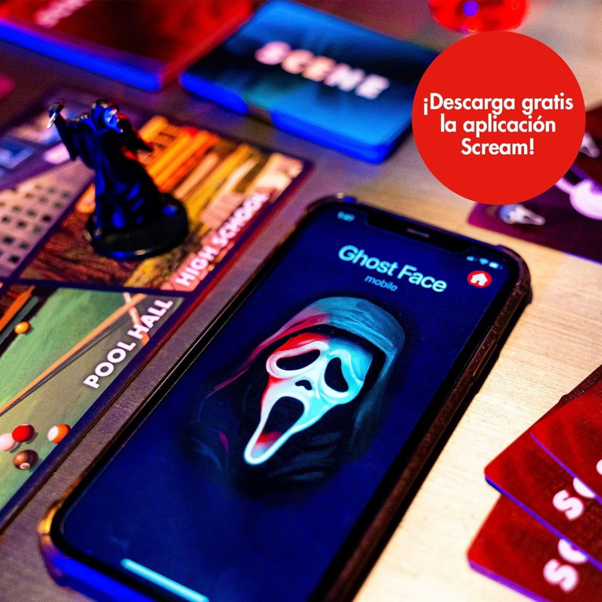 Juego de mesa Scream con app interactiva y llamadas de Ghost Face. Coopera y sobrevive en una partida llena de tensión y estrategia.