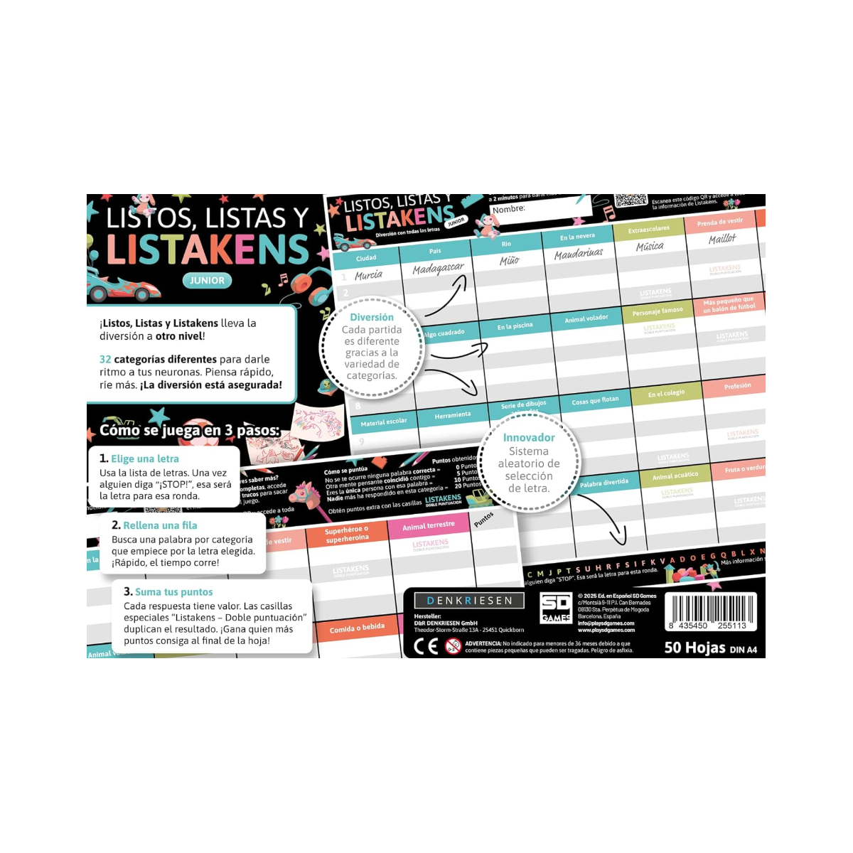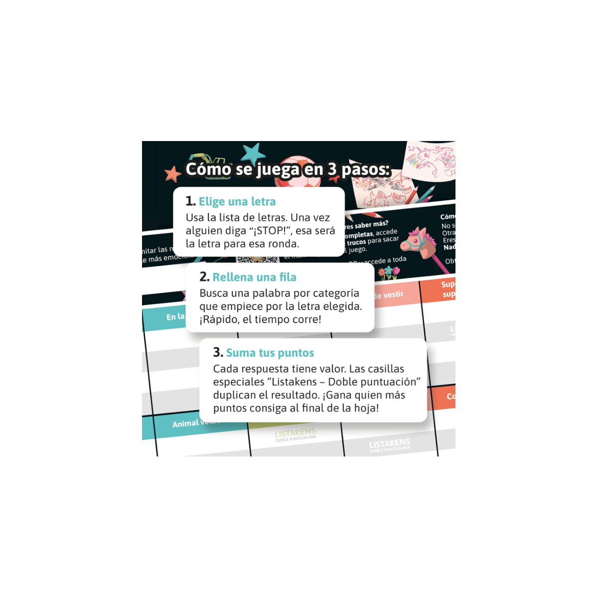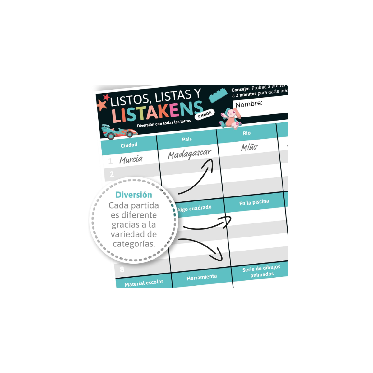 Este juego Listos Listas Y Listakens Junior pone a prueba tu rapidez mental con palabras, inteligencia rápida y muchas risas. En cada ronda se escoge una letra del alfabeto, se grita “¡STOP!” y en ese momento todos los jugadores tienen que escribir palabras que empiecen por esa letra en distintas categorías. Si consigues completar palabras en casillas especiales como “Listakens – Doble puntuación”, tu puntuación puede subir mucho, lo que añade emoción y tensión a cada jugada.