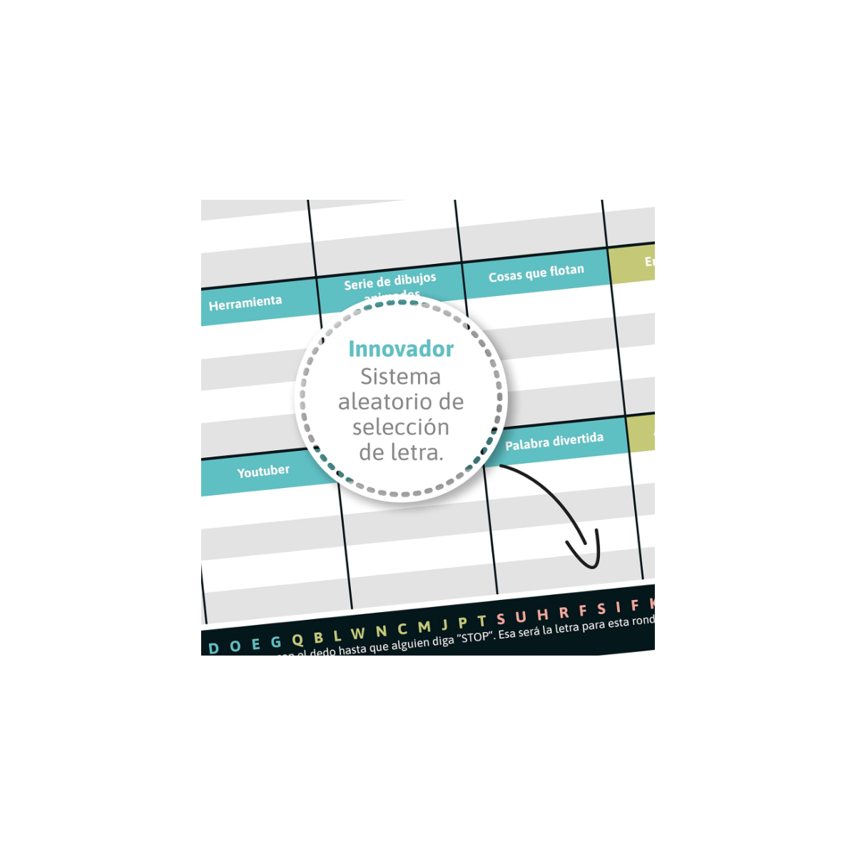 La marca SD Games entrega esta edición Junior con materiales resistentes y componentes bien presentados. El juego incluye un bloc de 50 hojas, cada hoja con 32 categorías diferentes para llenar en cada ronda, explicaciones claras y reglas fáciles de seguir. No necesita tablero ni fichas complicadas: solo lápiz, papel y ganas de pensar rápido. El diseño visual es sencillo pero efectivo, con tipografía legible y espacio suficiente para escribir sin agobios.