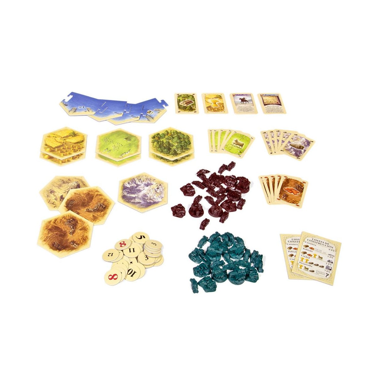 - Incluye 2 casillas de bosque, 2 casillas de pastos, 2 casillas de campo, 2 casillas de colinas, 2 casillas de montañas, 2 casillas de mar, 1 casilla de puerto, 1 casilla de puerto de lana, 1 casilla de desierto, 10 fichas de colonos, 8 fichas de ciudad, 30 fichas de camino, 25 cartas de recursos, 9 cartas de desarrollo y guía de juego