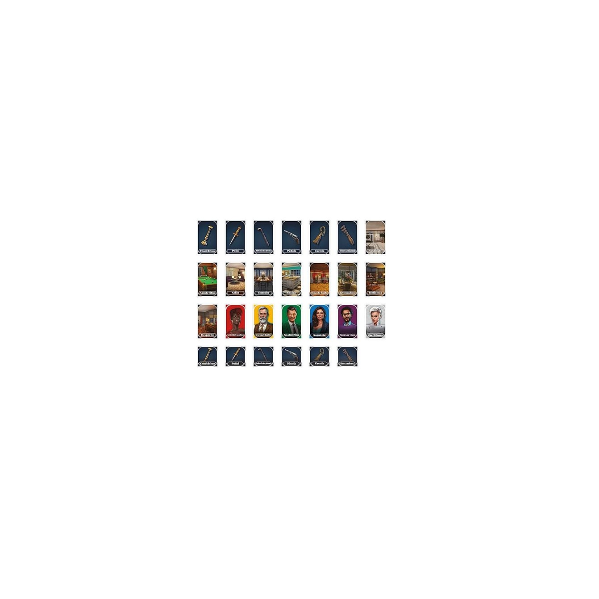 - Incluye tablero portátil, cartas de sospechosos, armas y habitaciones.