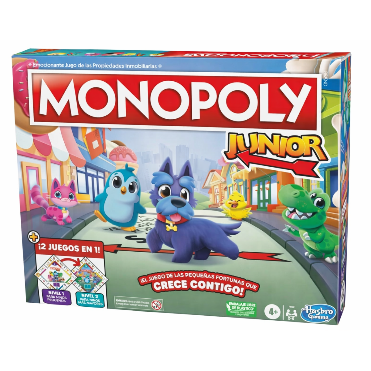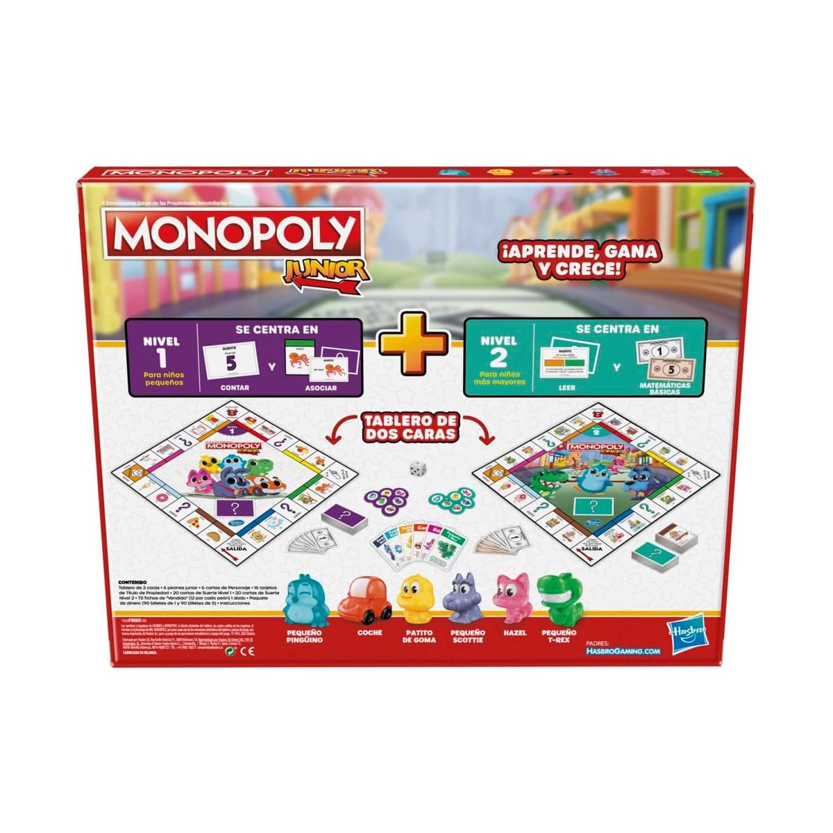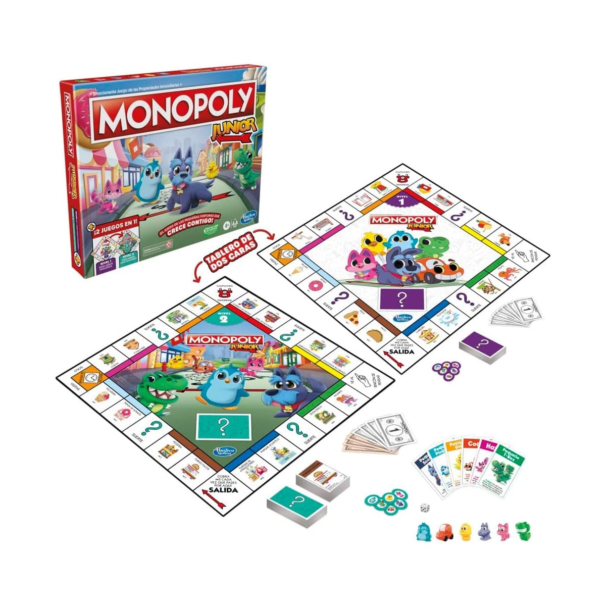 Descubre el juego de mesa Monopoly Junior 2 En 1, con dos niveles de juego que permite aprender y divertirse mientras se compran propiedades y se gestiona dinero.