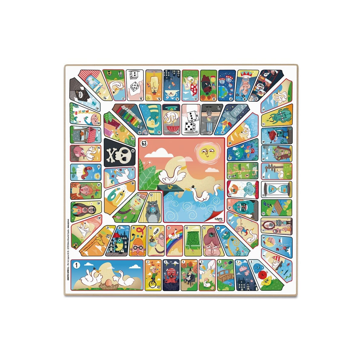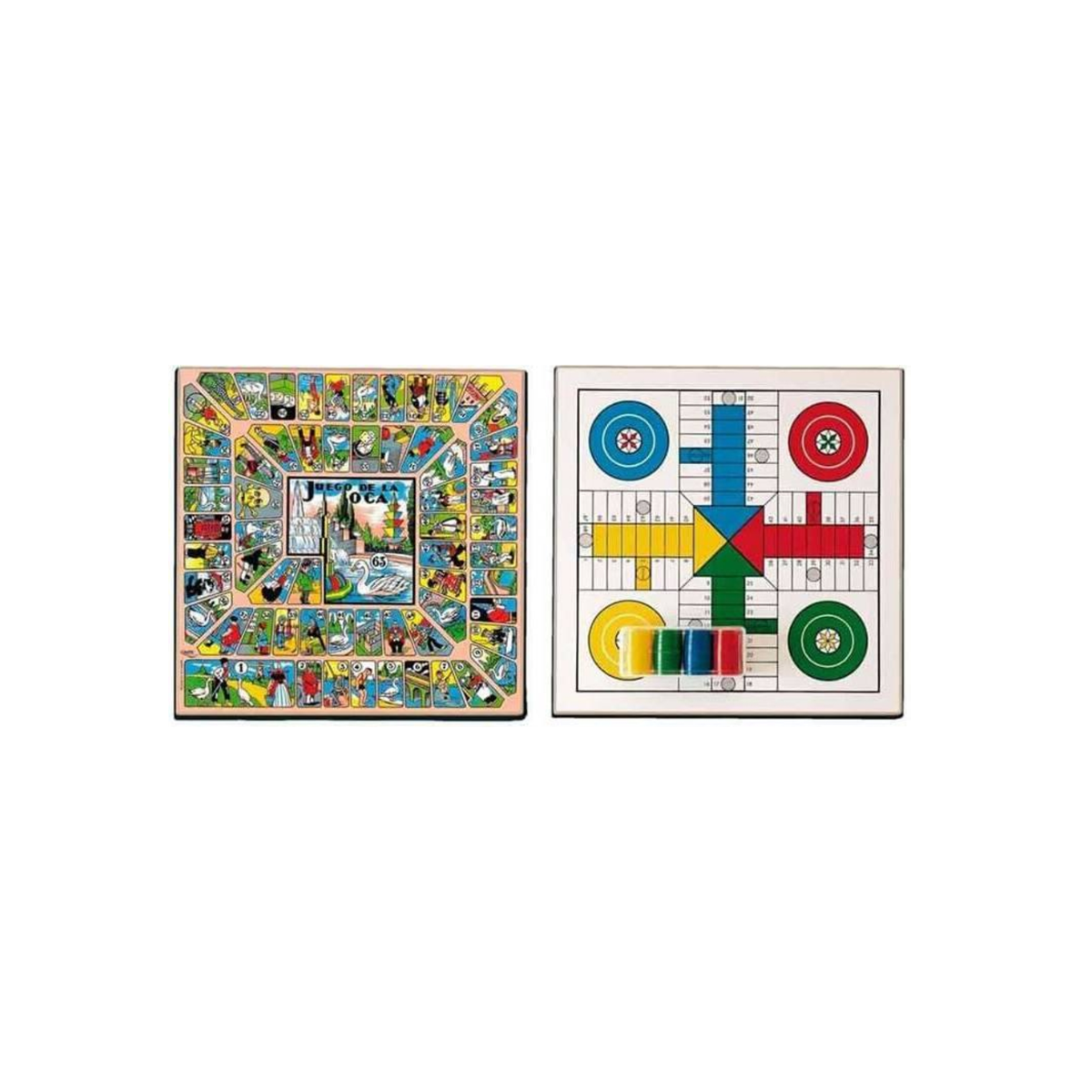 - Tablero de madera de doble cara: Parchís y Oca.