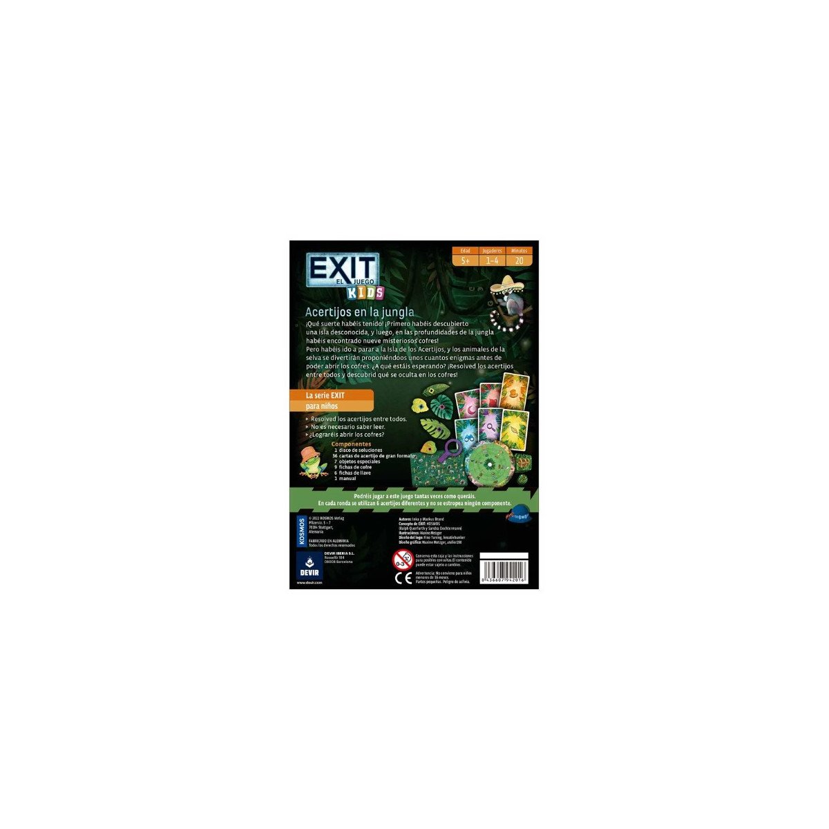 - Incluye un disco de soluciones, 36 cartas, 2 objetos especiales, 9 fichas cofre, 6 fichas de llave y manual