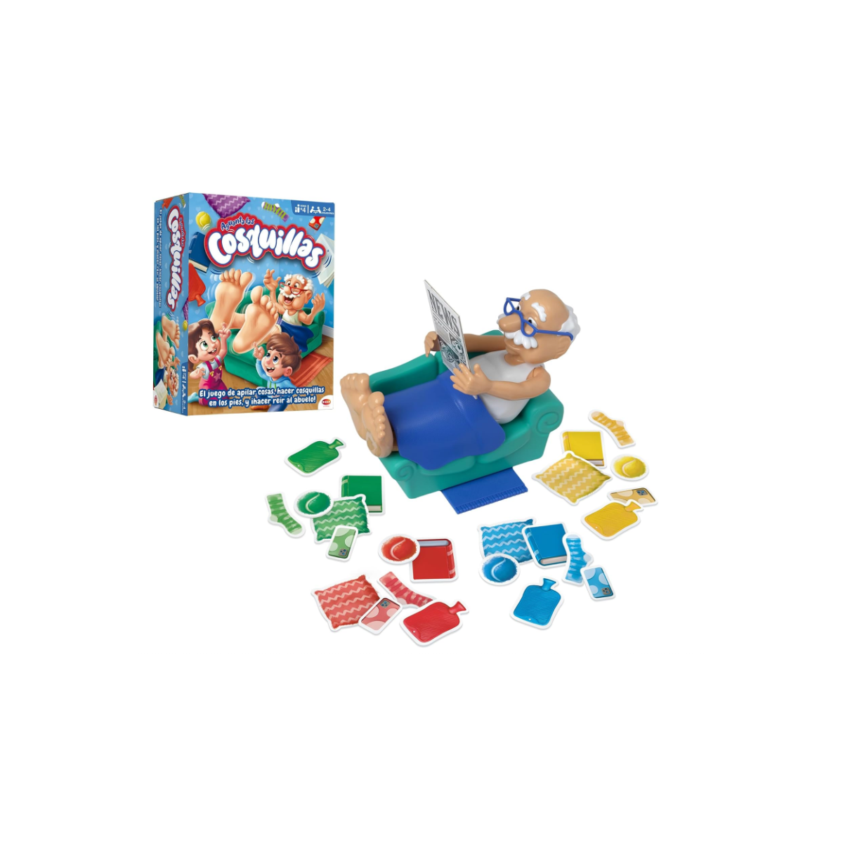 Ideal para niñas y niños desde 4 años, este juego Aguanta Las Cosquillas admite partidas de 2 a 4 jugadores y tiene una duración estimada de 10‑15 minutos, perfecta para grupos pequeños o momentos familiares. El contenido incluye una figura del abuelo, 24 objetos domésticos (como gafas, manta, periódico, etc.), una alfombra y las instrucciones necesarias para jugar. La mecánica es sencilla de aprender y muy atractiva desde el primer momento.