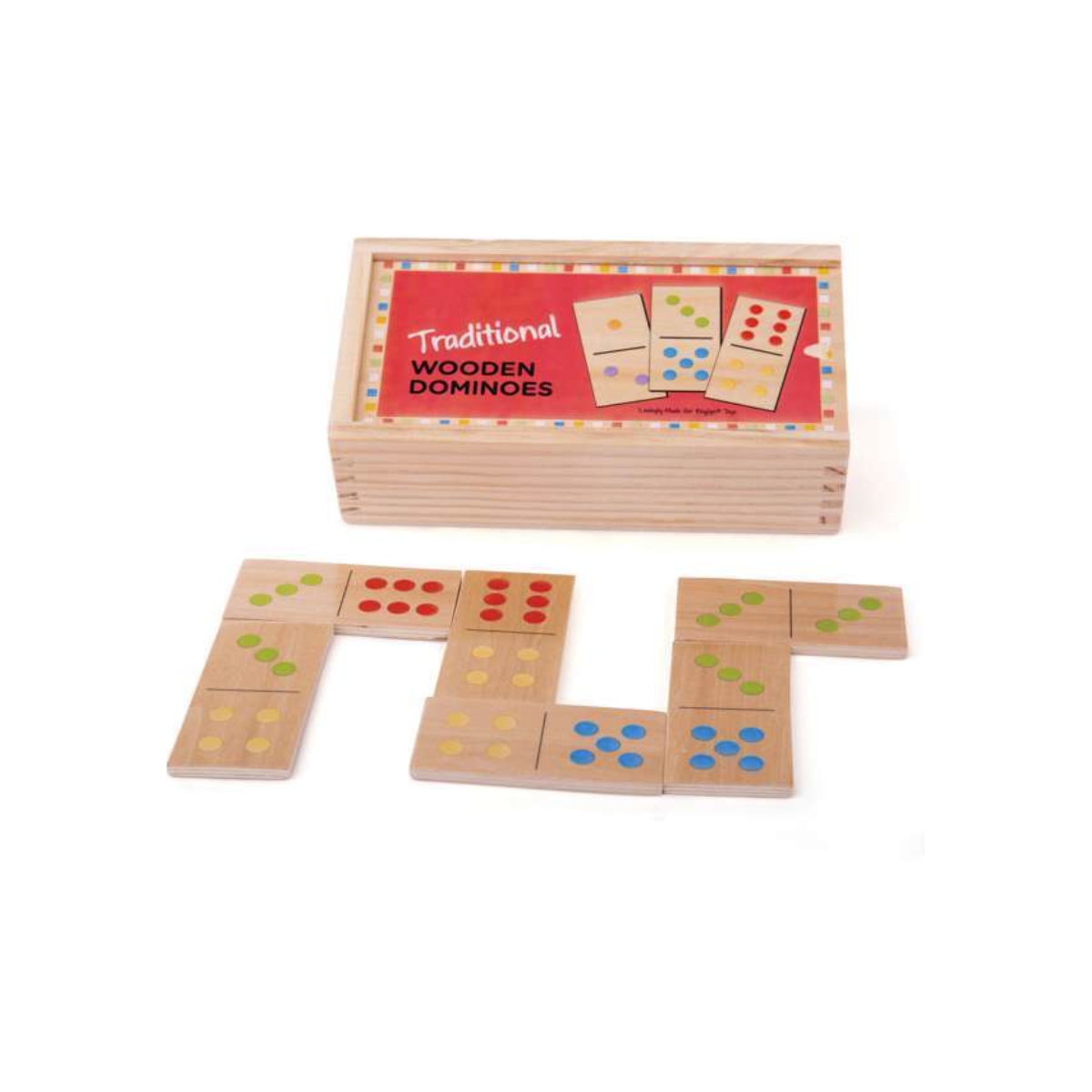 Dominó clásico de madera Bigjigs con 28 fichas y puntos de colores. Juego infantil ideal para aprender números mientras se desarrolla la memoria y la concentración.