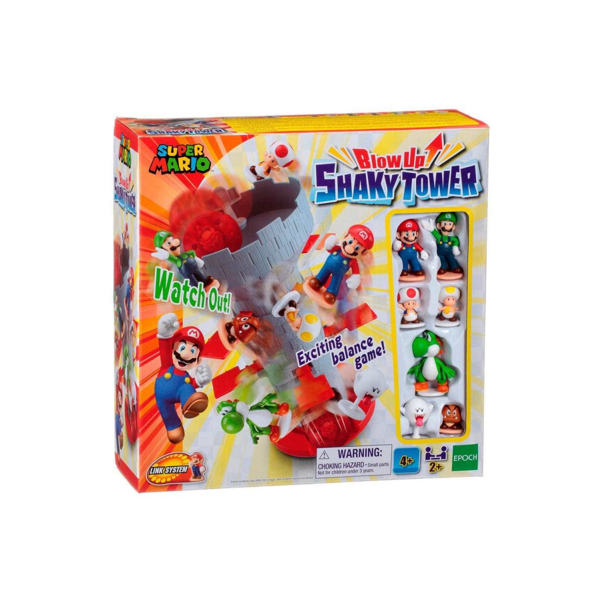 ¡El equilibrio lo es todo en el nuevo Super Mario Blow Up!! Shaky Tower! Un juego de mesa lleno de tensión, risas y mucha emoción, donde el objetivo es mantener a salvo a Mario, Luigi y sus amigos… ¡sin despertar a Bowser! Esta torre inestable pondrá a prueba el pulso y la estrategia de toda la familia, convirtiéndose en el centro de atención en cualquier reunión.