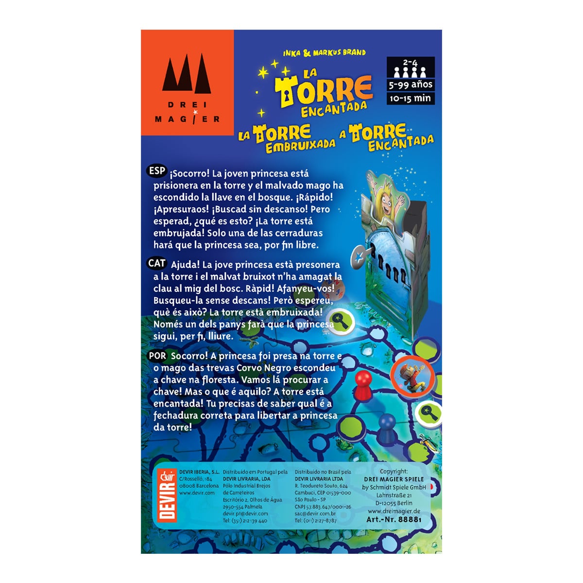 La Torre Encantada es un juego infantil lleno de misterio y diversión, ahora en formato compacto. En cada partida, uno de los jugadores se convierte en el malvado mago Cuervonegro, que encierra a la princesa en la torre y esconde la llave para impedir su rescate. El resto formará el equipo que intentará liberarla antes de que sea demasiado tarde.