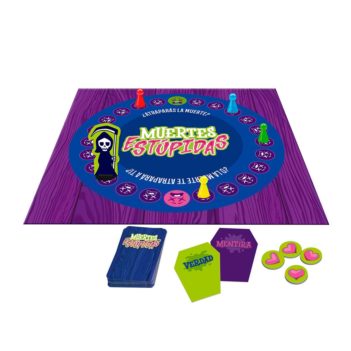 Con el juego de mesa Muertes Estúpidas tendrás que utilizar tu intuición para averiguar si la muerte curiosa que te están contando es real o ficticia. Sé el último en aguantar en el tablero esquivando a la Muerte o construye la palabra muerte con las cartas para ser el ganador.