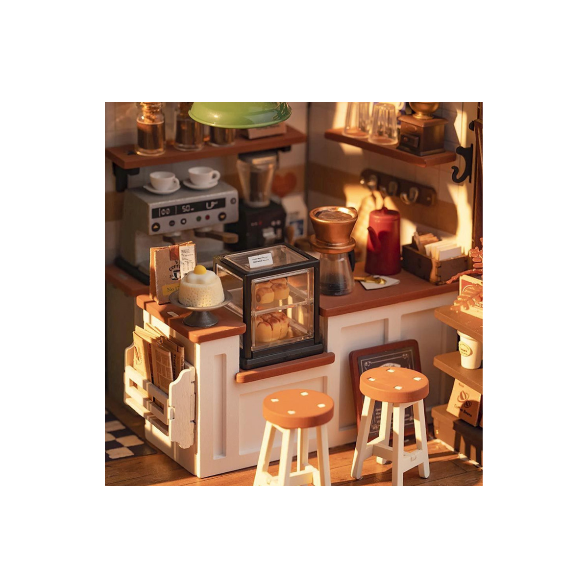 El set incluye piezas de madera precortadas con láser, accesorios en miniatura, materiales de decoración y elementos de cartelería con estilo vintage. Cada rincón está pensado para transmitir la esencia de una cafetería real: desde las cafeteras en la barra hasta las flores en la mesa, todo invita a tomarse un respiro y disfrutar del montaje. Además, no se necesita pegamento especial ni herramientas complejas, por lo que cualquier persona con un poco de paciencia puede montarla.