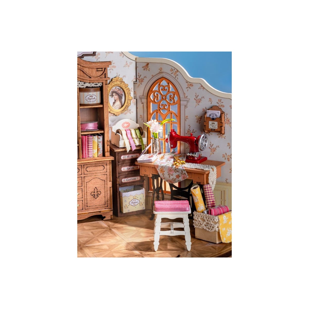 Maqueta Elsa’s Tailoring con 330 piezas para construir un taller de costura vintage en miniatura con iluminación LED y detalles decorativos.