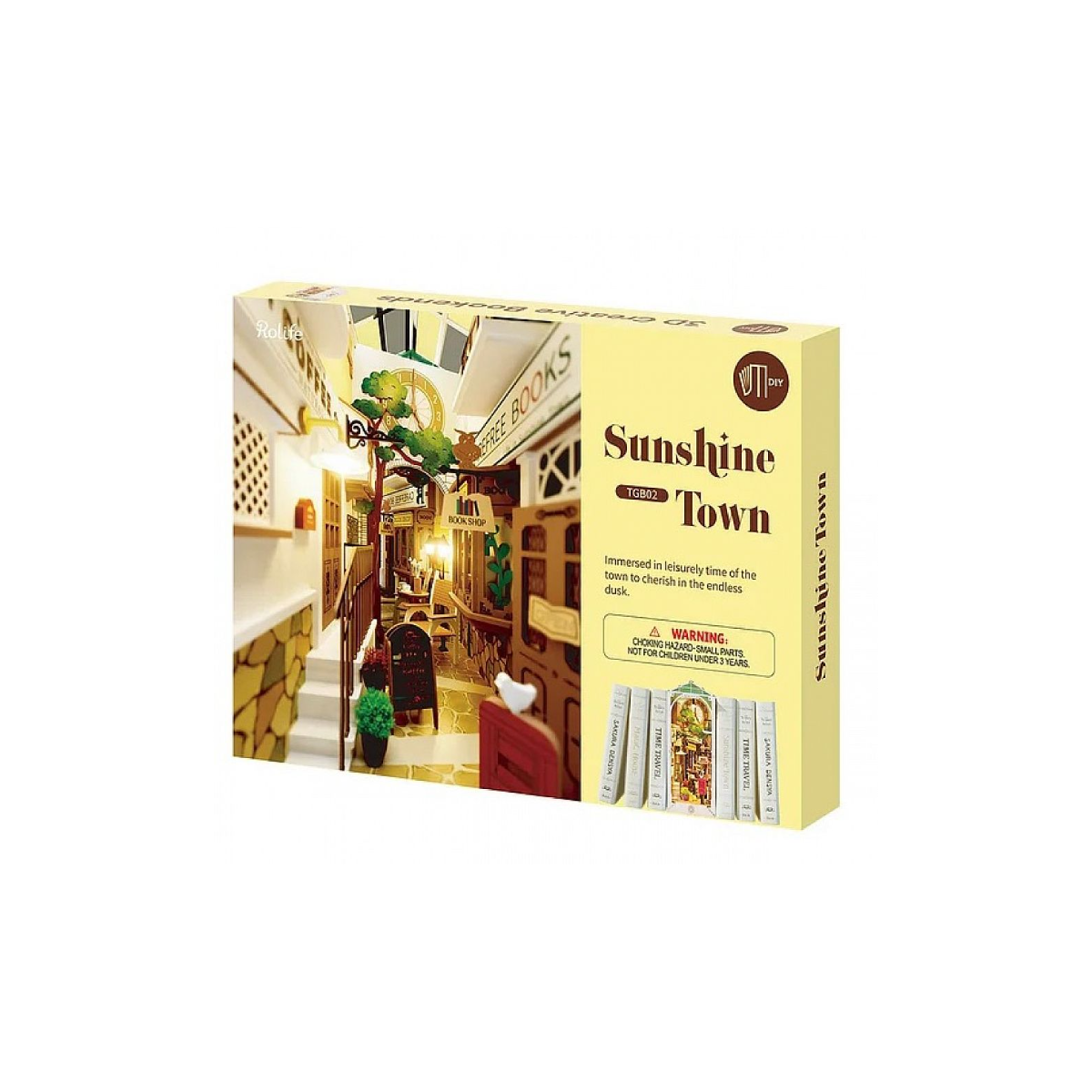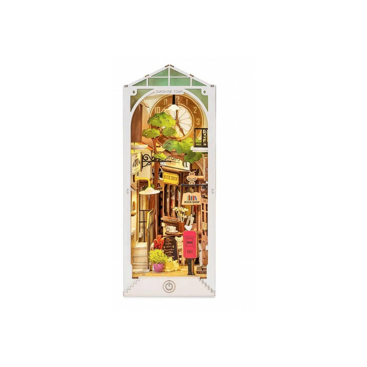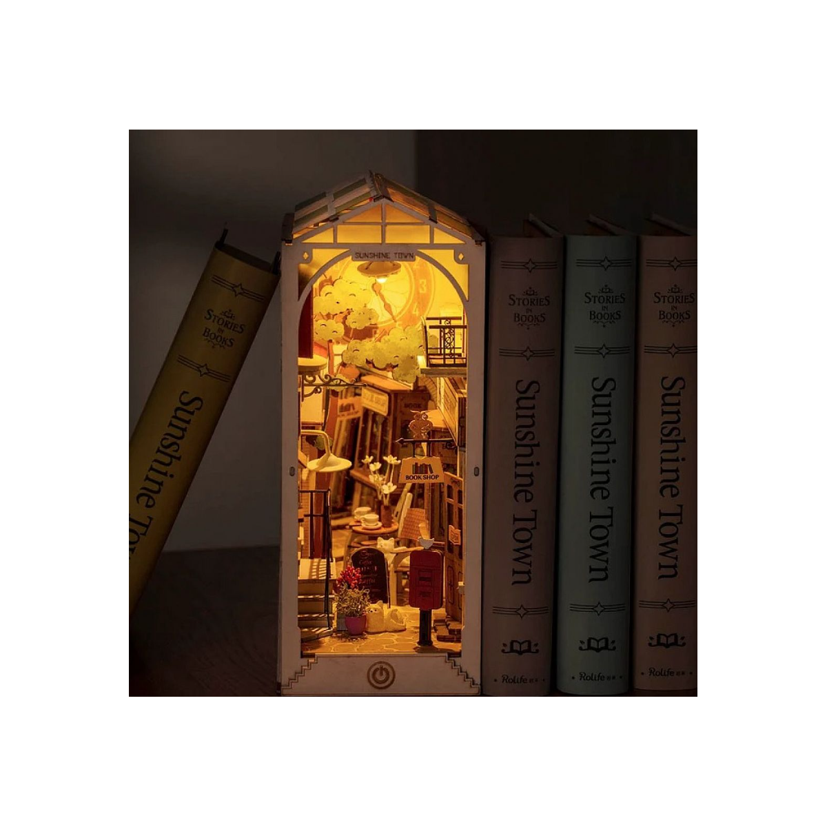 Sumérgete en un rincón encantador lleno de detalles que evocan la calidez de los pequeños pueblos. La maqueta sujeta libros Sunshine Town es mucho más que una simple decoración. Este set DIY te permite construir una escena en miniatura con estética de librería vintage, calles empedradas, faroles cálidos y escaparates llenos de encanto. Una vez montada, esta pequeña ciudad cobra vida gracias a su sistema de iluminación LED, transformando cualquier estantería en un lugar lleno de magia.