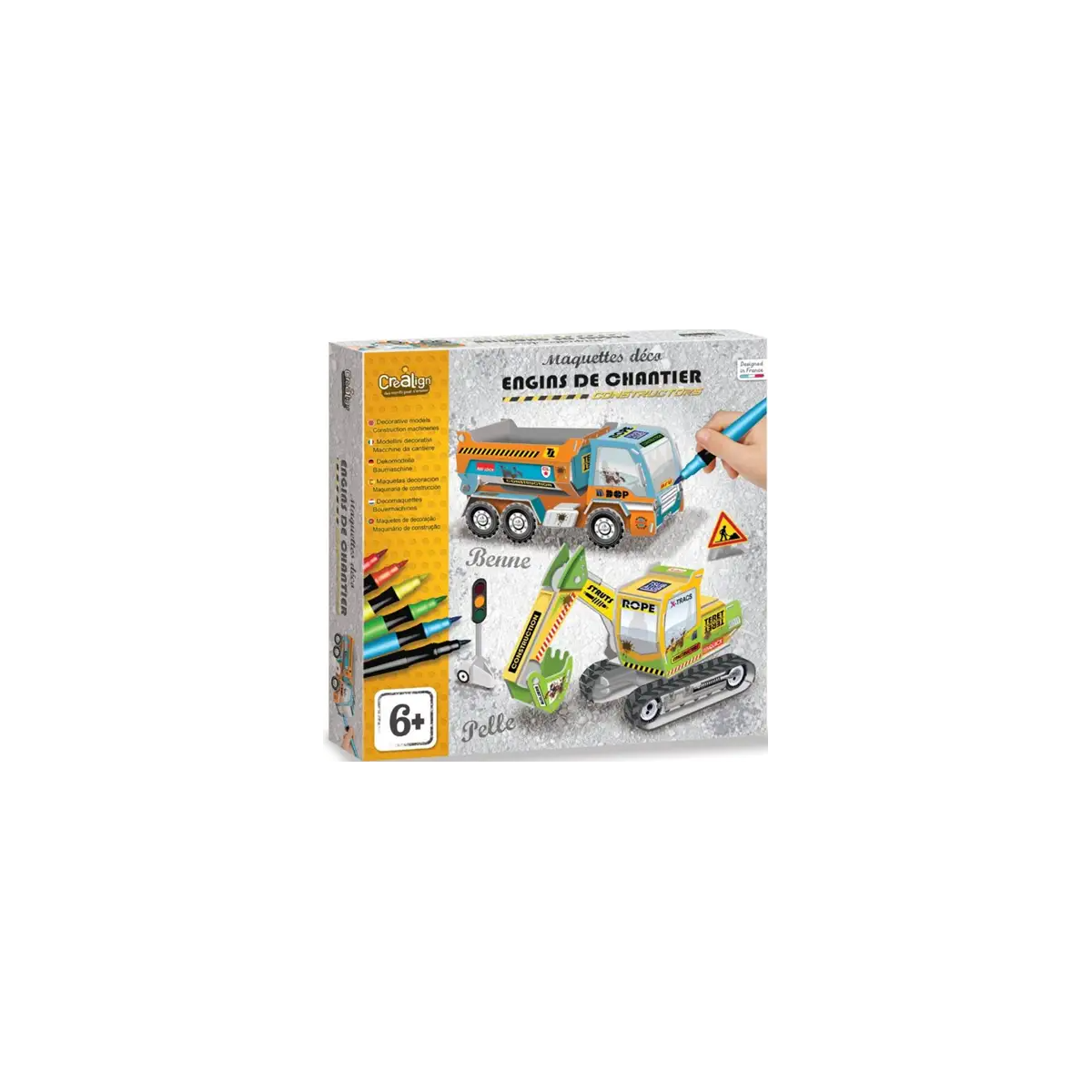 Dentro de la caja encontrarás todo lo necesario para montar paso a paso dos vehículos de construcción: una excavadora y un camión volquete. Las piezas precortadas en cartón se ensamblan fácilmente sin necesidad de tijeras, y después llega la parte más divertida: decorar cada vehículo con los rotuladores incluidos y personalizarlo con pegatinas para darle un aspecto auténtico de maquinaria de obra.