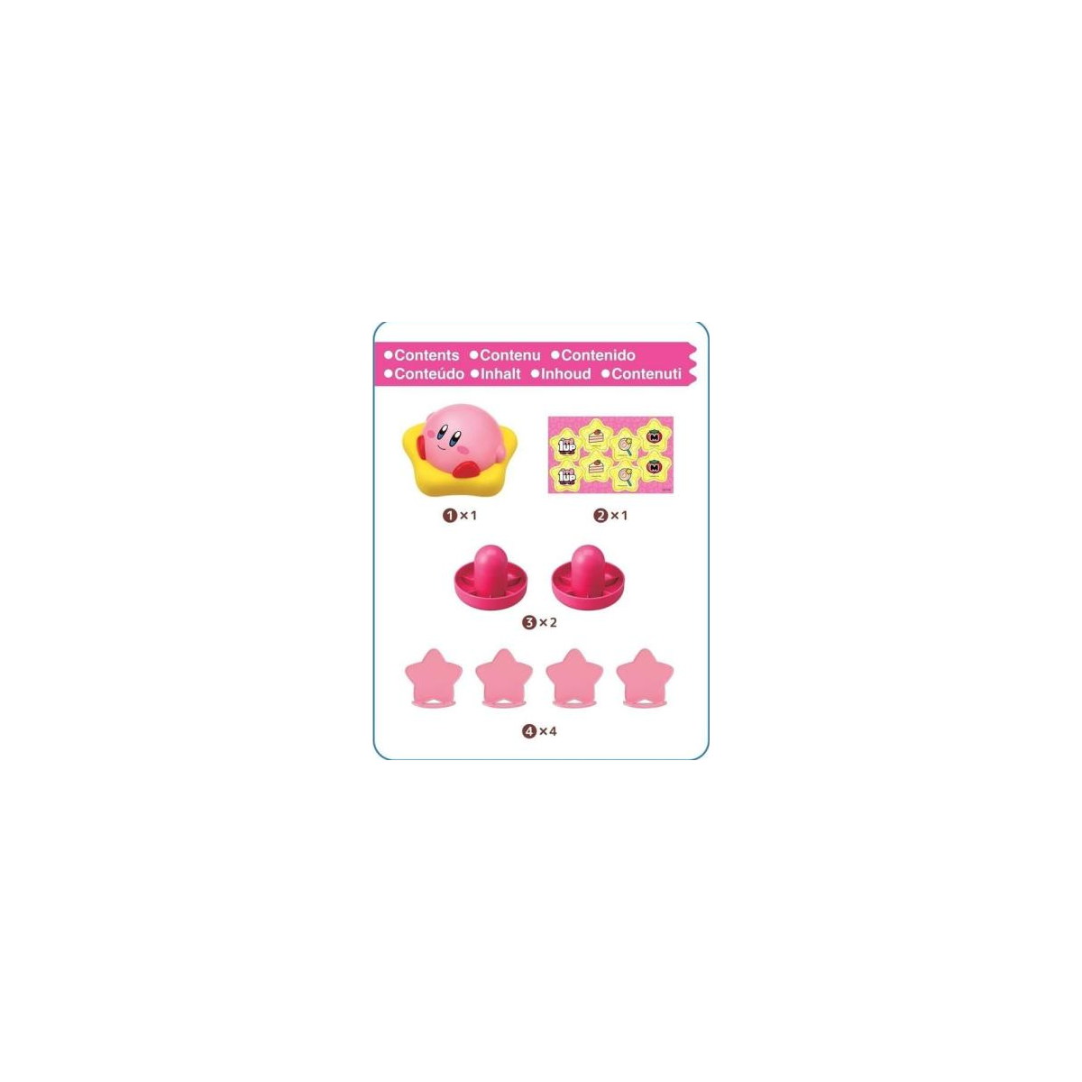 El set incluye la figura de Kirby sobre su estrella, dos lanzadores y varias fichas objetivo, con iconos clásicos del universo Kirby. Las partidas pueden jugarse en solitario o entre dos jugadores, lo que permite competir para ver quién consigue más puntos.