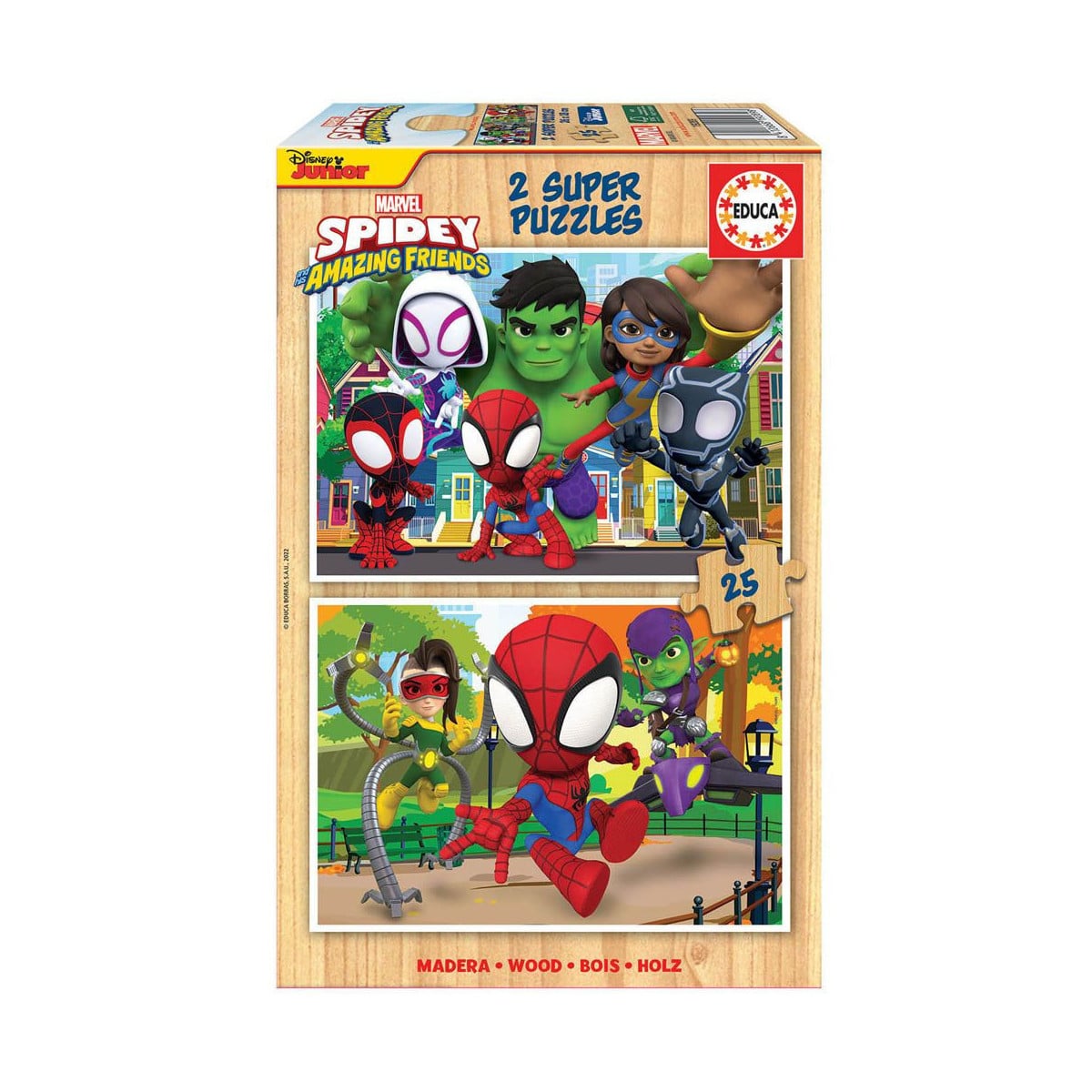 Pack de 2 puzzles de 25 piezas cada uno de los personajes de los dibujos animados Spidey. Las piezas están fabricadas en madera.