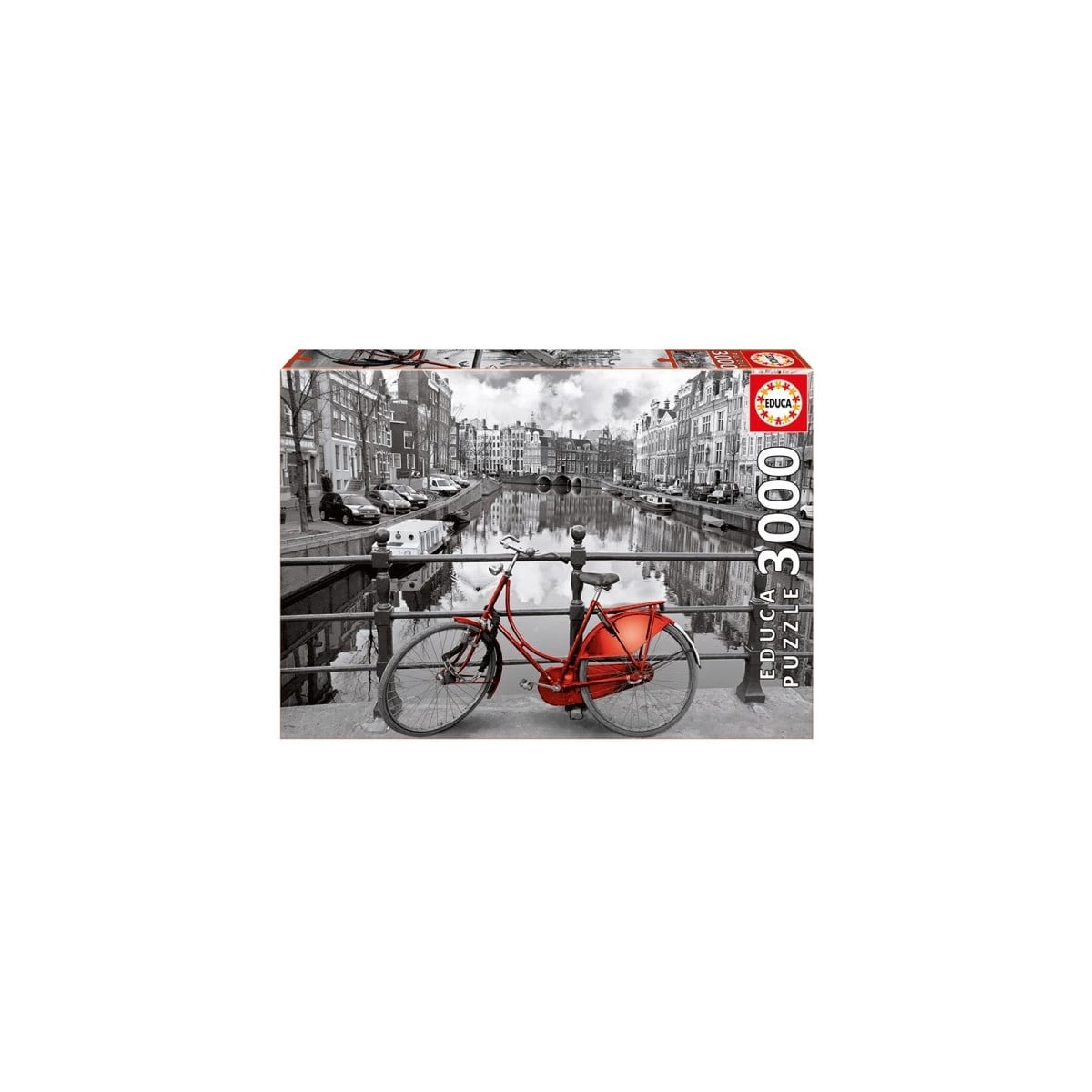 Puzzle de 3000 piezas con una escena de Amsterdam. El puzzle es en blanco y negro y el toque de color se lo da la una bicicleta roja. El puzzle montado mide aproximadamente 120cm x 85 cm.