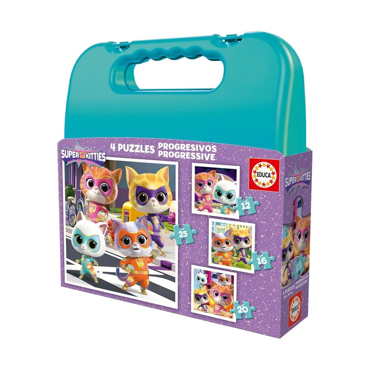Descubre la Maleta Puzzle Progresivos SuperKitties de Educa con 4 puzzles en una práctica maleta. Diversión, aprendizaje y un regalo perfecto desde los 3 años.