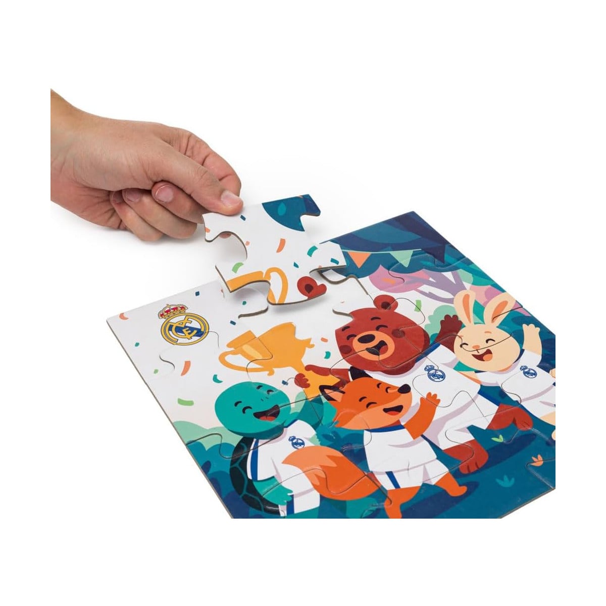 Puzle infantil Real Madrid de 12 piezas con ilustraciones futboleras. Piezas grandes y resistentes ideales para niños y niñas desde 2 años.